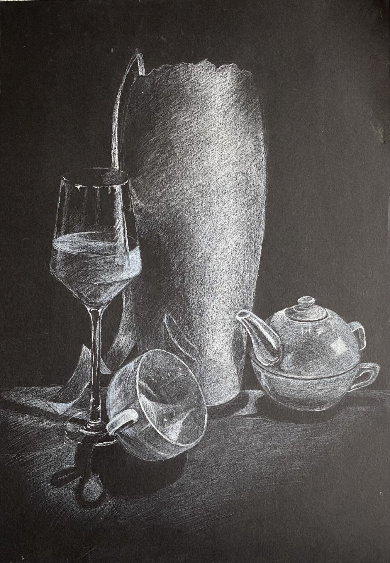 Dzień dobry mam na sprzedaż rysunek „Still nature”. Rysunek wykonany białą kredką na czarnym papierze. Wymiary rysunku 35/50cm.