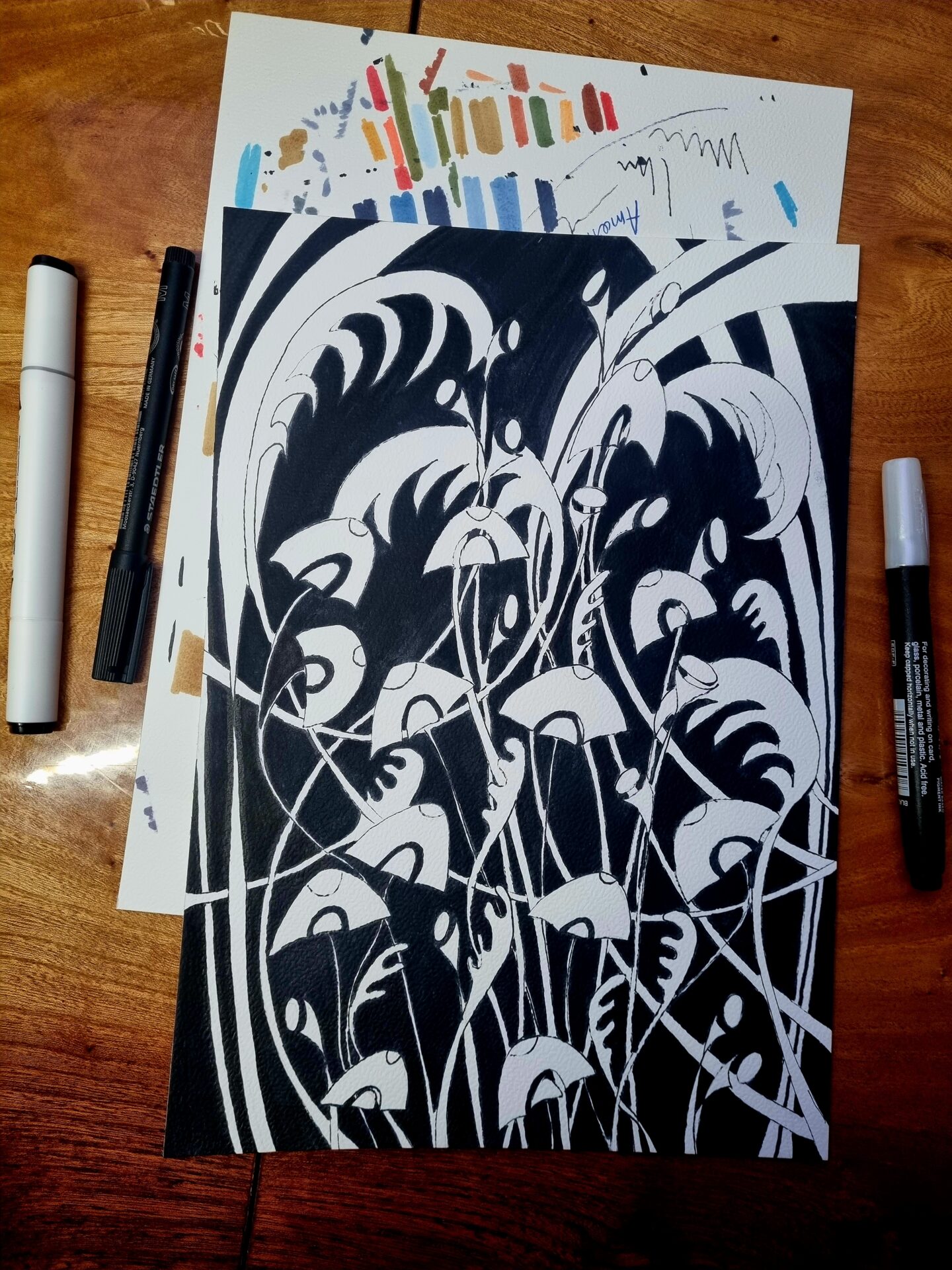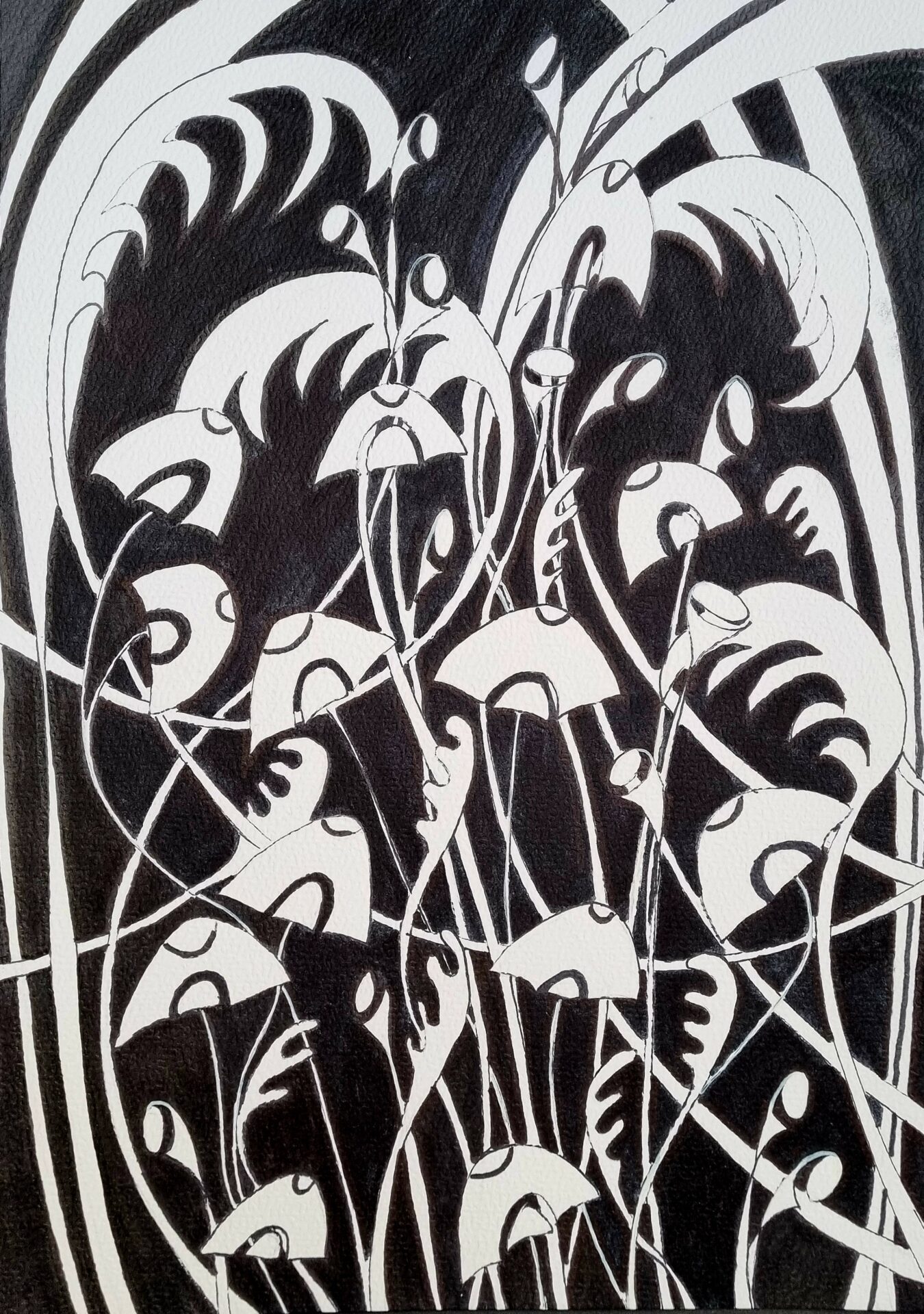 Czarno-biała grafika przedstawia kwiaty i roślinność w abstrakcyjnych kształtach, zainspirowanych letnią łąką zakwitłą rumiankiem i stokrotkami. Kwiaty mają nieregularne formy, przypominające geometryczne figury, a ich płatki oraz łodygi stworzą jednolity obraz, ale wyrazistymi liniami. Kontury traw i liści, które płynnie przechodzą w tło, nadając kompozycji lekkości. Gra świateł i cieni podkreśla kontrast między strukturą roślin a przestrzenią, w której się znajdują, tworząc nowoczesny i minimalistyczny efekt. Idealna dekoracja do wnętrz w stylu skandynawskim, nowoczesnym lub industrialnym. Obraz zatrzymuje ten szczególny moment, gdy oślepione letnim słońcem oczy tworzą pod zamkniętymi powiekami abstrakcyjny film tworzony z ostatniego zarejestrowanego momentu.