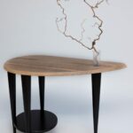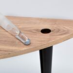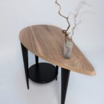 Blat tego stolika kolorem i kształtem przywodzi na myśl kawałek drewna oszlifowanego przez ocean. Zaprojektowany jako stolik pomocniczy, który możesz ustawić z boku fotela lub kanapy. Doskonale będzie wyglądał w sypialni, salonie lub bibliotece z ułożonymi na blacie książkami i piękną różą w szklanym flakonie. Stolik został wykonany z drewna brzozowego, wysokogatunkowej sklejki oraz naturalnego forniru z orzecha amerykańskiego. Szklany flakonik został wykonany ręcznie i każdy egzemplarz jest nieco inny. Można do niego również włożyć gałązkę leszczyny pogiętej (jest w komplecie ze stolikiem). Mebel ma sygnaturę i certyfikat autentyczności.