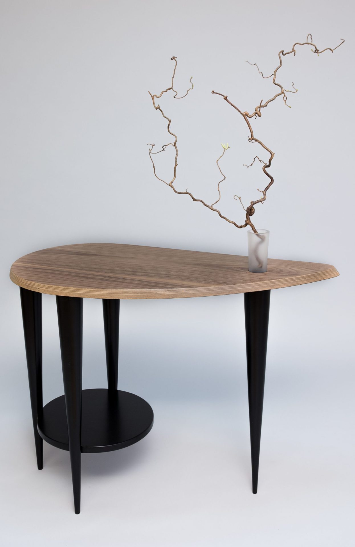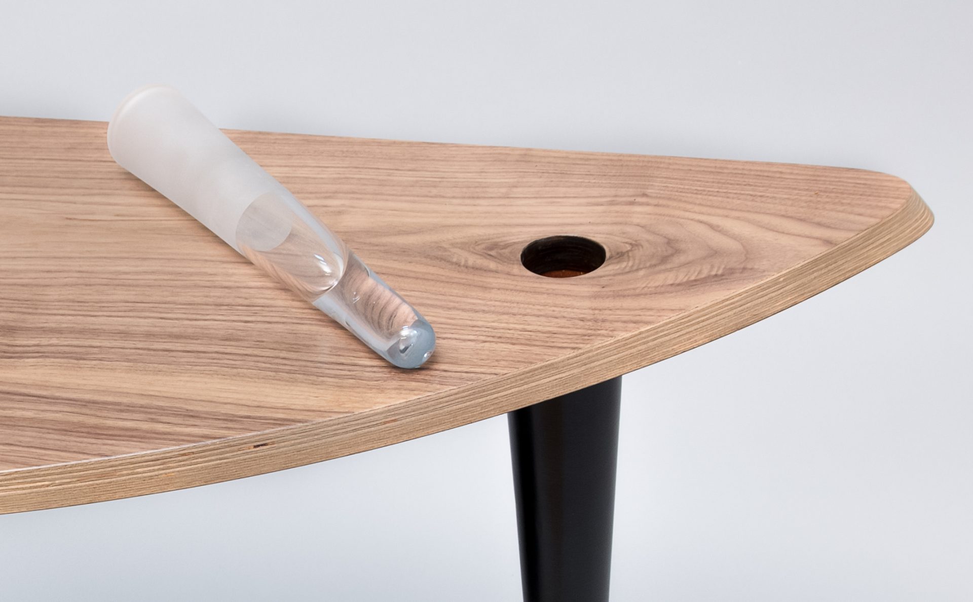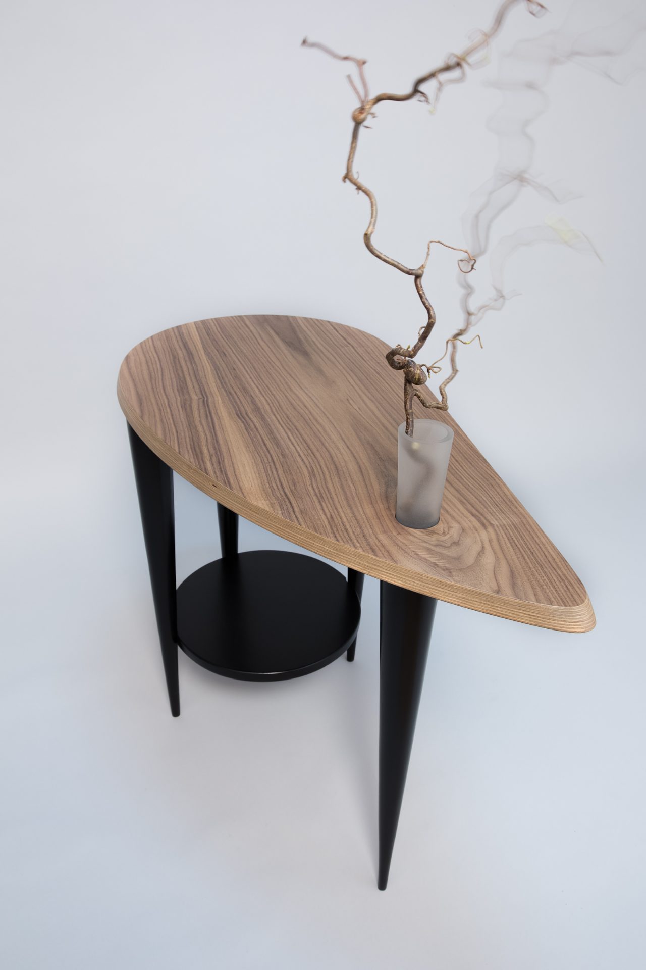 Blat tego stolika kolorem i kształtem przywodzi na myśl kawałek drewna oszlifowanego przez ocean. Zaprojektowany jako stolik pomocniczy, który możesz ustawić z boku fotela lub kanapy. Doskonale będzie wyglądał w sypialni, salonie lub bibliotece z ułożonymi na blacie książkami i piękną różą w szklanym flakonie. Stolik został wykonany z drewna brzozowego, wysokogatunkowej sklejki oraz naturalnego forniru z orzecha amerykańskiego. Szklany flakonik został wykonany ręcznie i każdy egzemplarz jest nieco inny. Można do niego również włożyć gałązkę leszczyny pogiętej (jest w komplecie ze stolikiem). Mebel ma sygnaturę i certyfikat autentyczności.