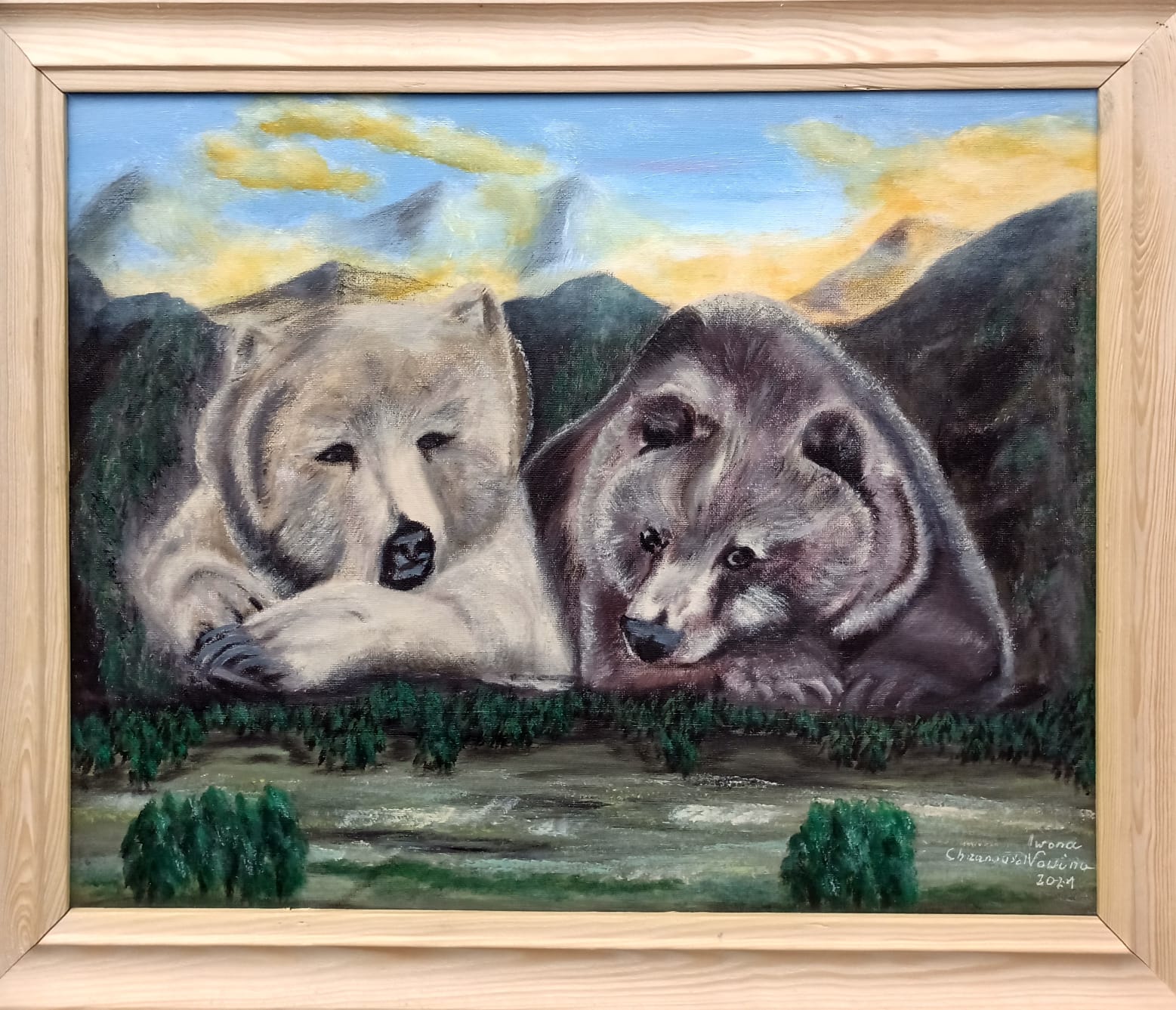 Obraz inspirowany wyobraźnią. Namalowany farbami akrylowymi na płótnie, zabezpieczony werniksem. Wymiary uwzględniają ramę.