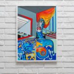 Tło obrazu, pełne geometrycznych kształtów i perspektywicznych linii, przypomina labirynt lub nieskończony korytarz, prowadzący do nieznanych miejsc. Te architektoniczne elementy symbolizują nieskończoność i złożoność ludzkiego umysłu, w którym sny splatają się z rzeczywistością, tworząc zawiłe ścieżki myśli i uczuć.
