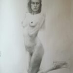 Obraz przedstawia nagą postać kobiety wykonaną w ołówku, której ciało zdaje się delikatnie wyłaniać z białego tła. Subtelne cienie modelują kształty, tworząc delikatną grę światła i cienia. Kobieta patrzy w dół, a jej twarz emanuje spokojem. Atmosfera obrazu jest pełna wewnętrznej harmonii. Ciepło czuć w tej ciszy, jakby czas stanął w miejscu. Styl artystyczny jest realistyczny. Widać dbałość o detale, a technika użycia ołówka daje wrażenie delikatności i precyzji.