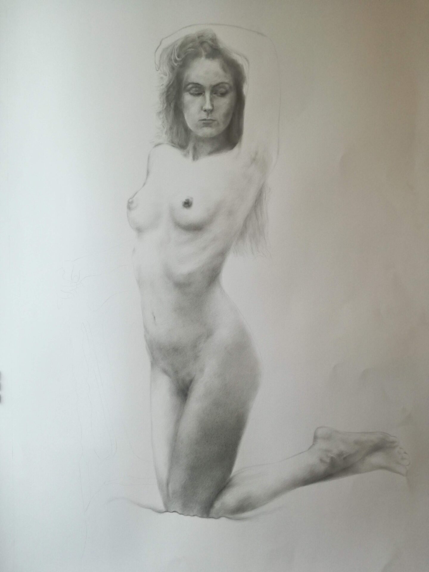 Obraz przedstawia nagą postać kobiety wykonaną w ołówku, której ciało zdaje się delikatnie wyłaniać z białego tła. Subtelne cienie modelują kształty, tworząc delikatną grę światła i cienia. Kobieta patrzy w dół, a jej twarz emanuje spokojem. Atmosfera obrazu jest pełna wewnętrznej harmonii. Ciepło czuć w tej ciszy, jakby czas stanął w miejscu. Styl artystyczny jest realistyczny. Widać dbałość o detale, a technika użycia ołówka daje wrażenie delikatności i precyzji.