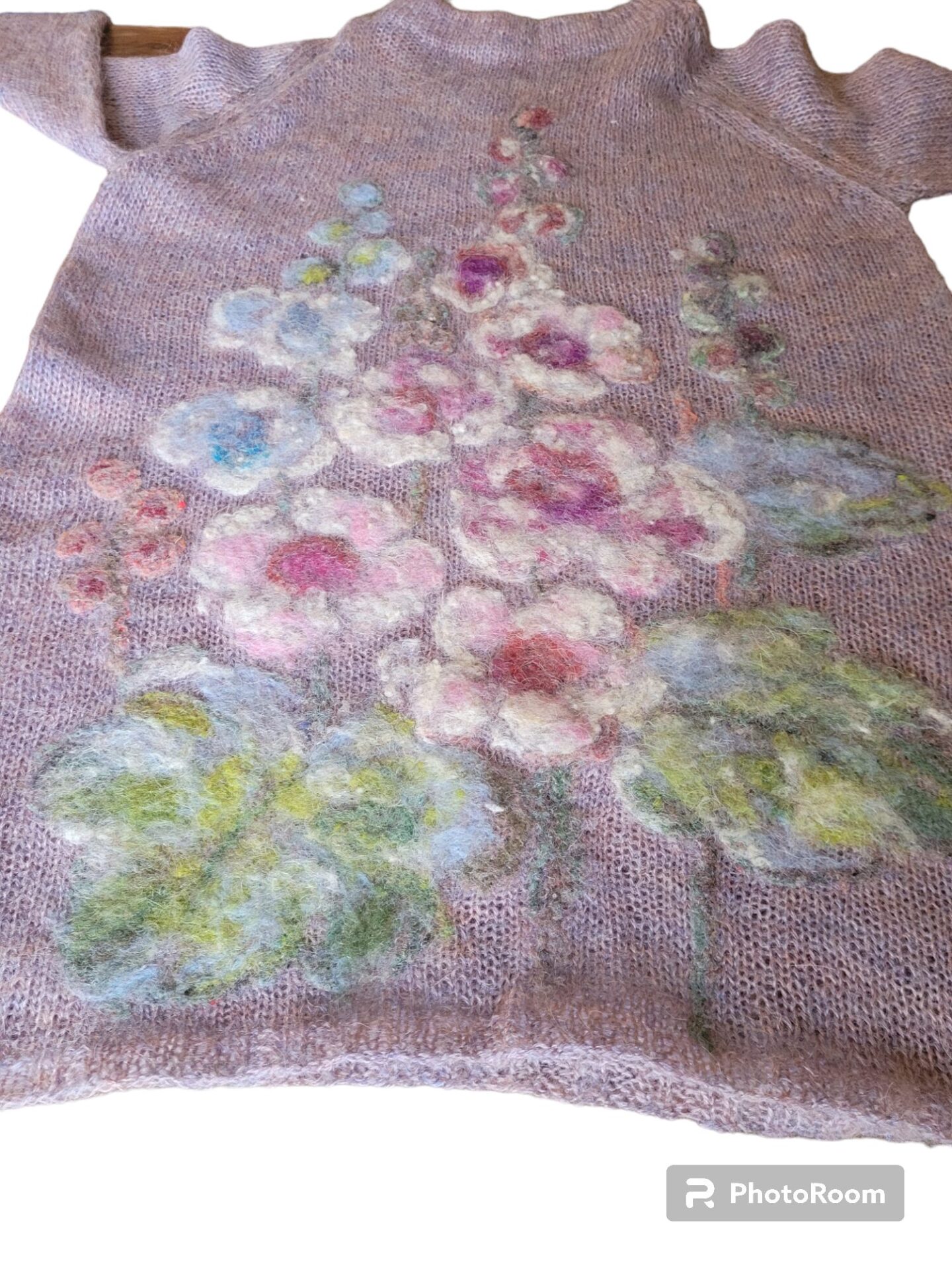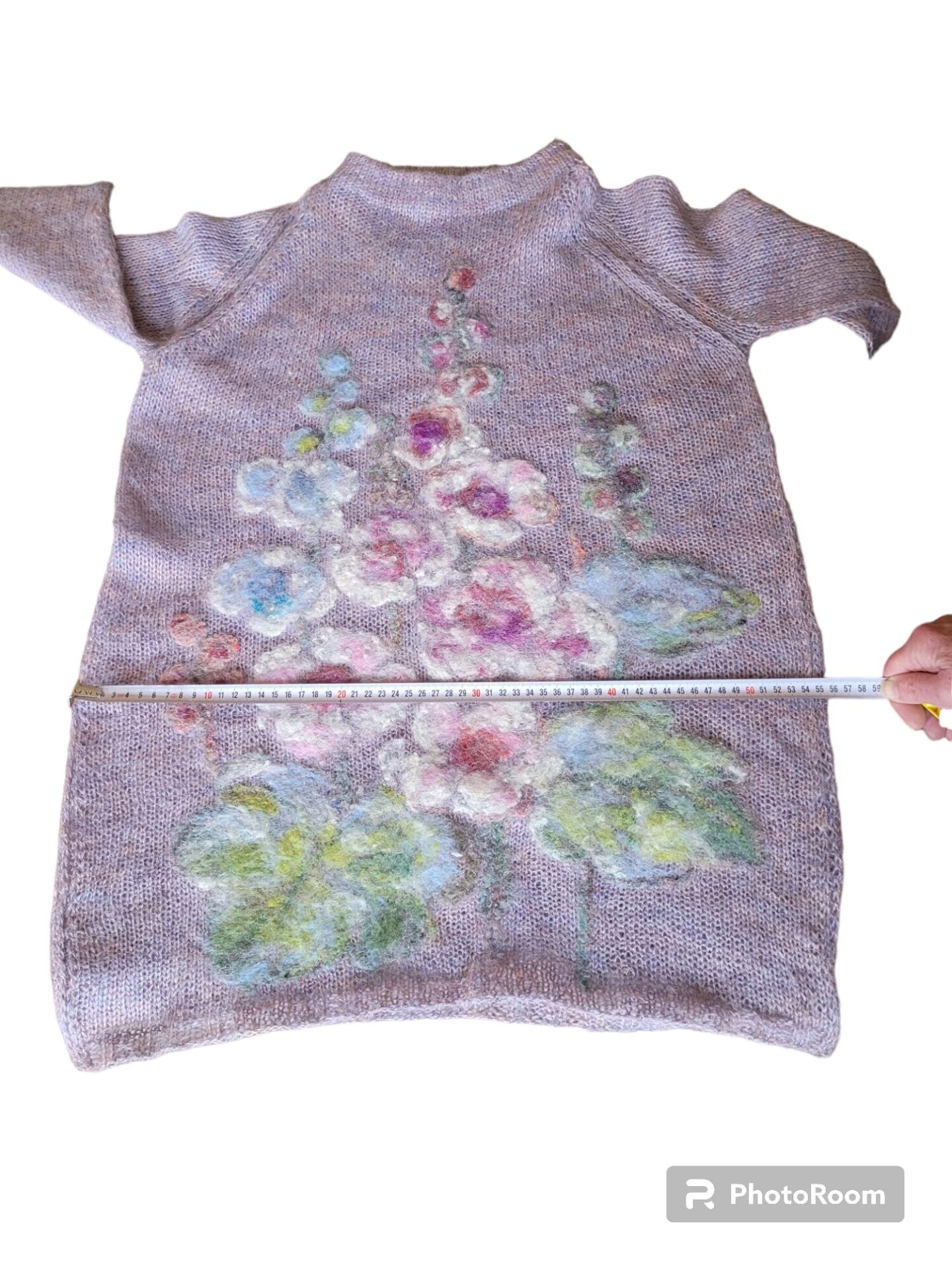 sukienka z delikatnej welny w kolorze pudrowy roz,z nafilcowana aplikacja przedstawiajaca malwy