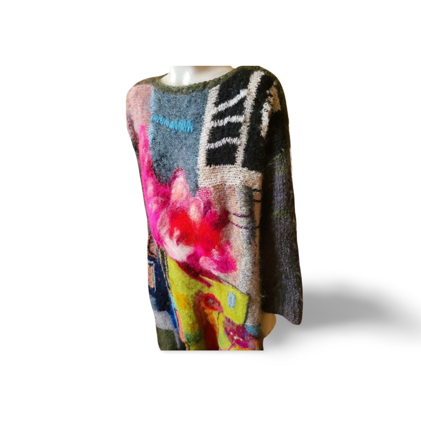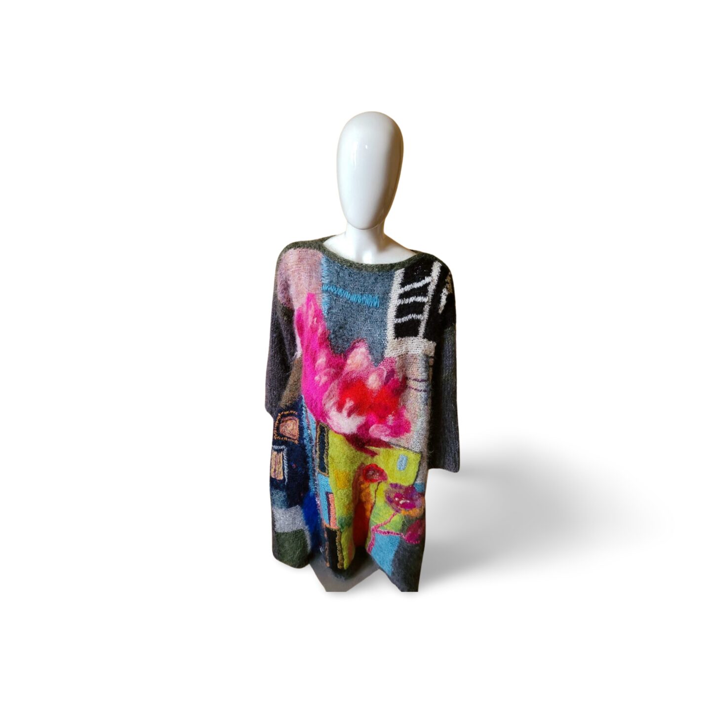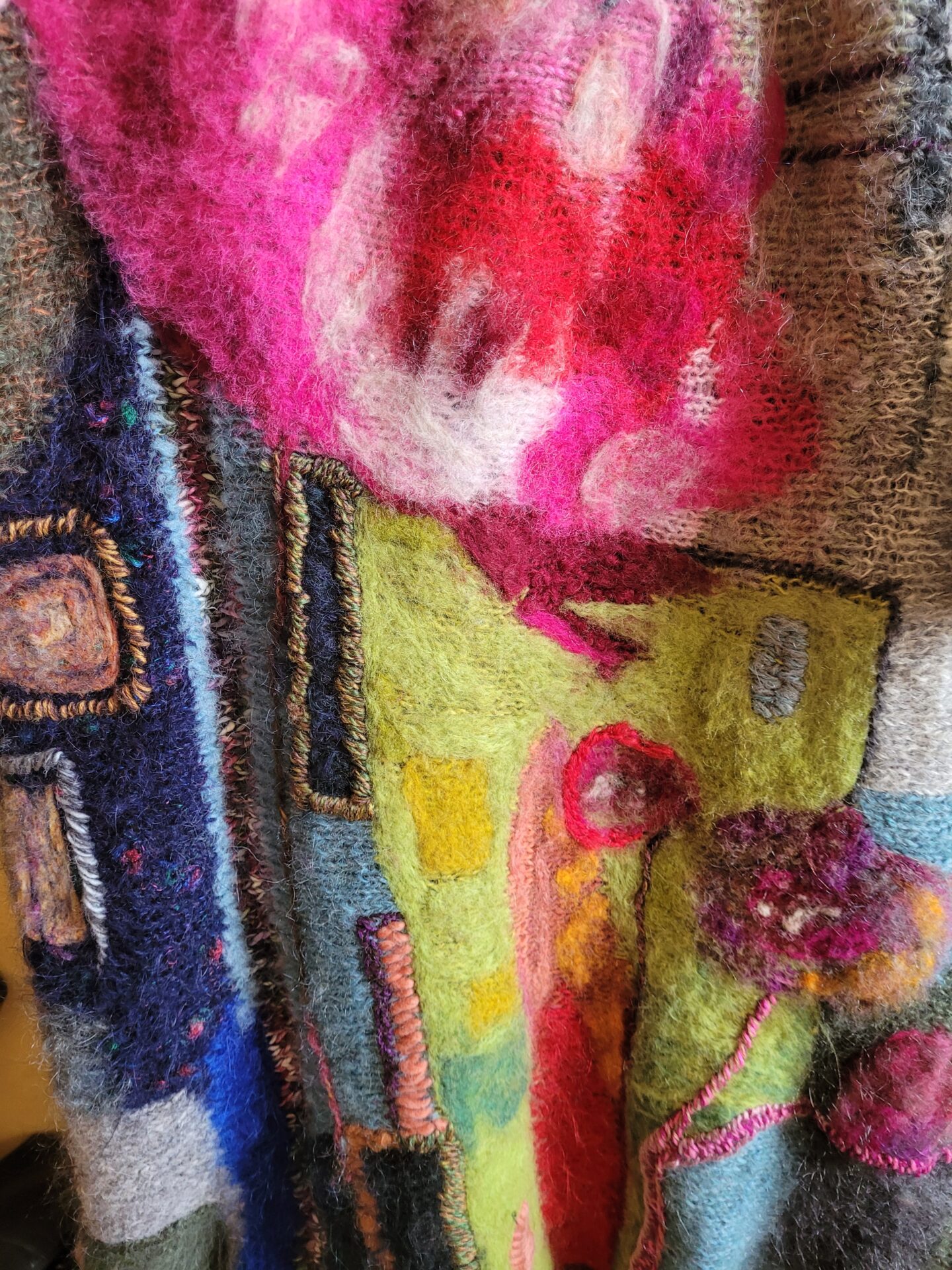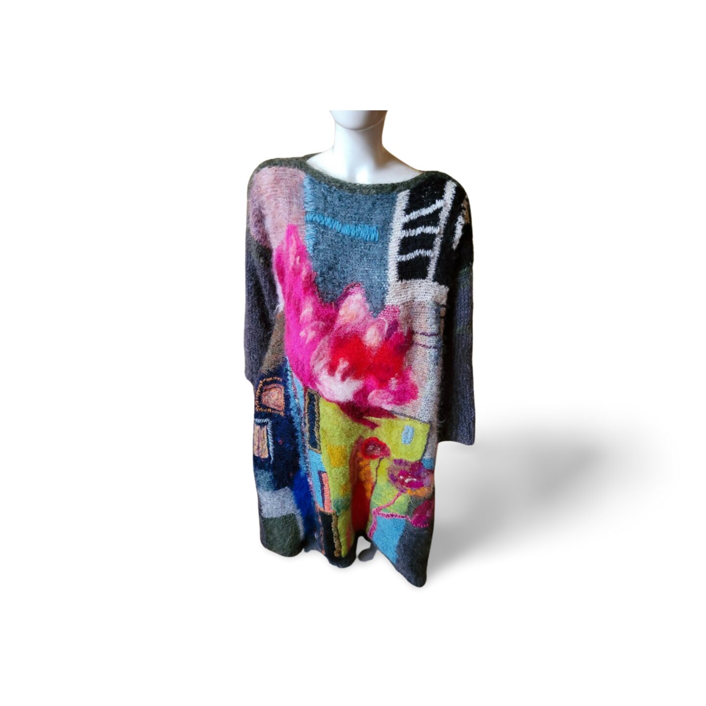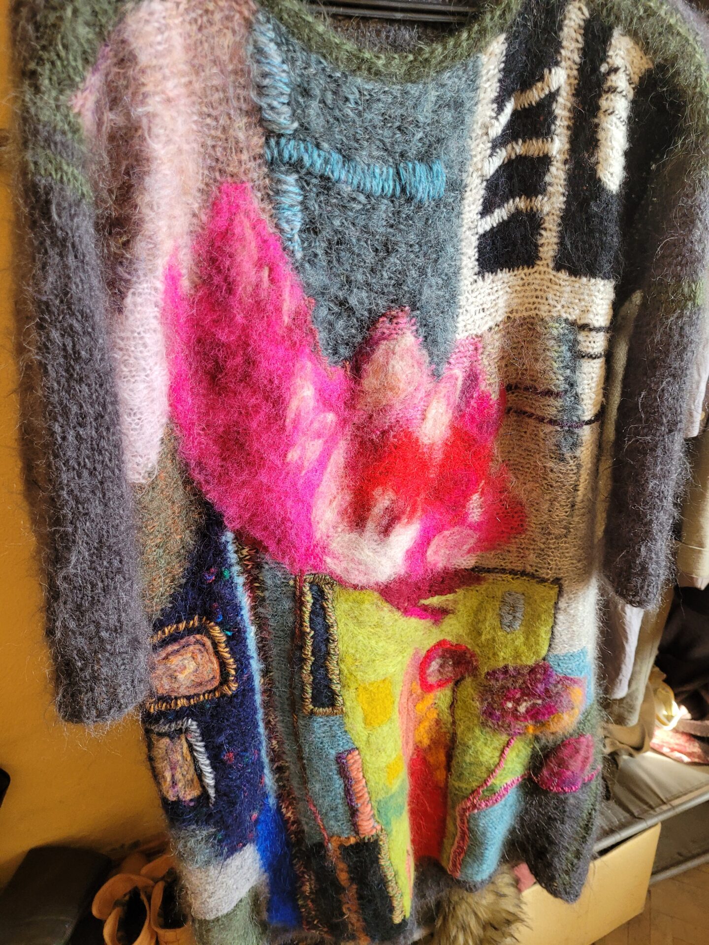 sukienka-welna moher,recznie robiona motyw malarski.aplikacja haftowana-filcowana i naszywana