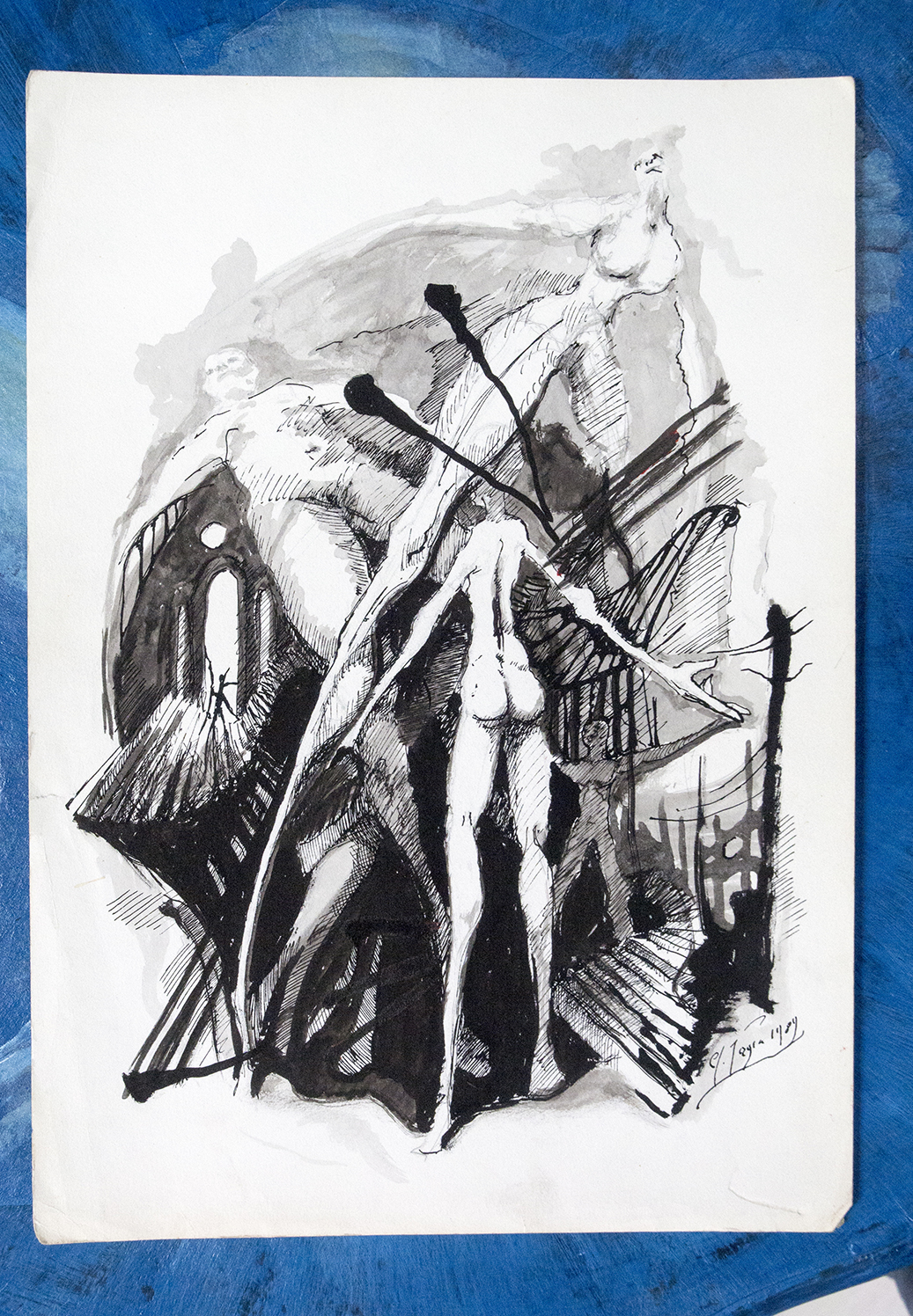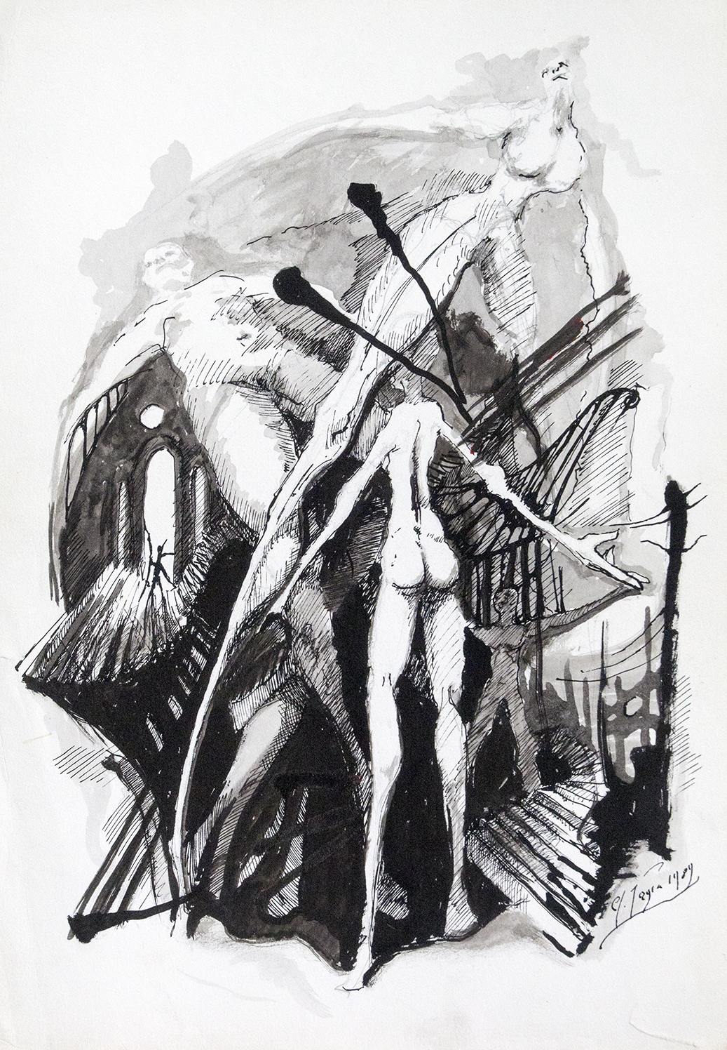 Praca w tuszu rysunek z 1989r na papierze talensa nie oprawiona.Praca brała udział w wystawie indywidualnej w 1990r w Bibliotece Raczyńskich w Poznaniu.Cena dotyczy reprodukcji na papierze fotograficznym 30 x 20 cm .Każda praca jest sygnowana z tyłu.