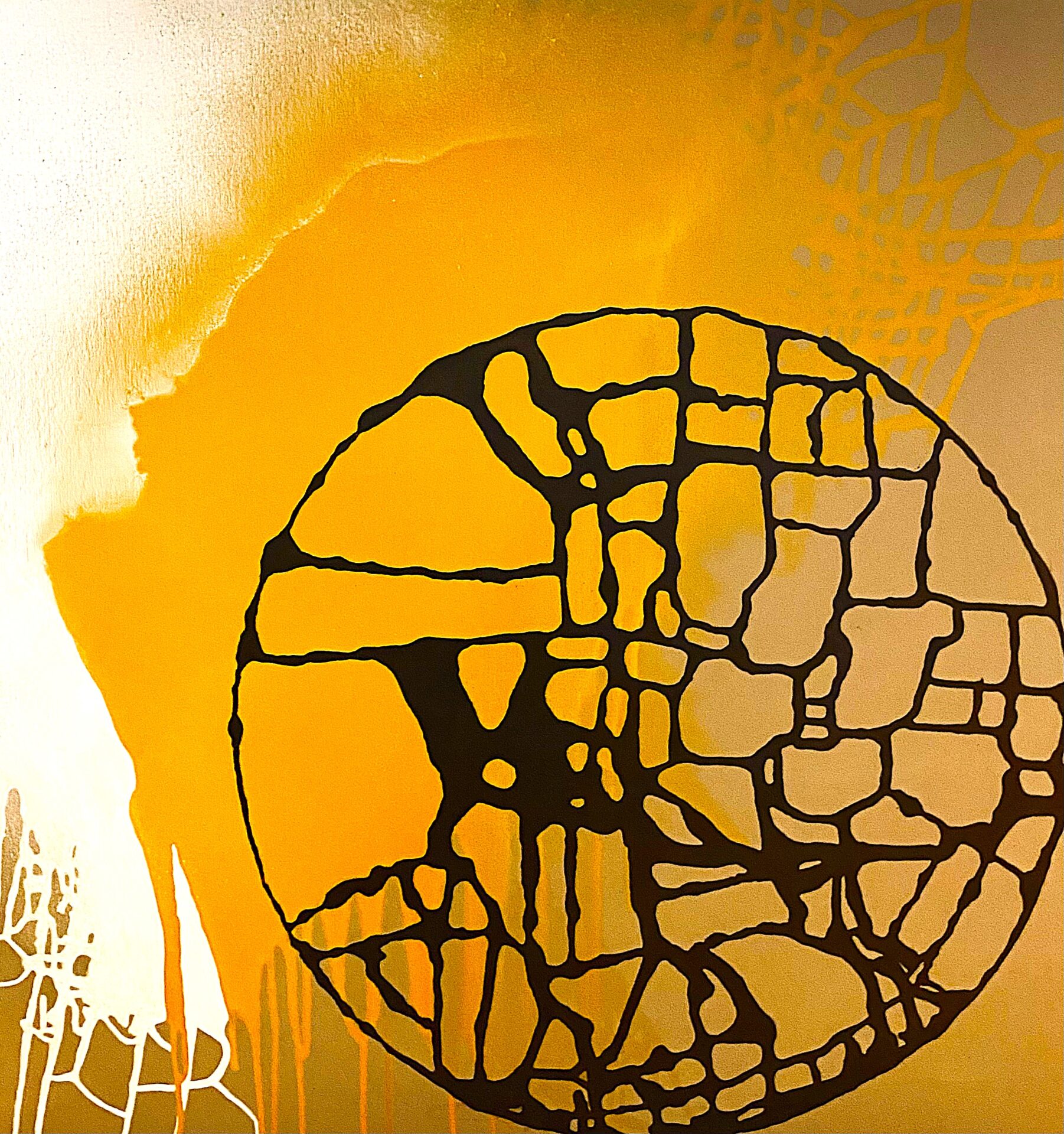 Obraz o wymiarach 100×100, malowany farbami akrylowymi na płótnie, boki płótna zmalowane na czarno, gotowy do powieszenia.