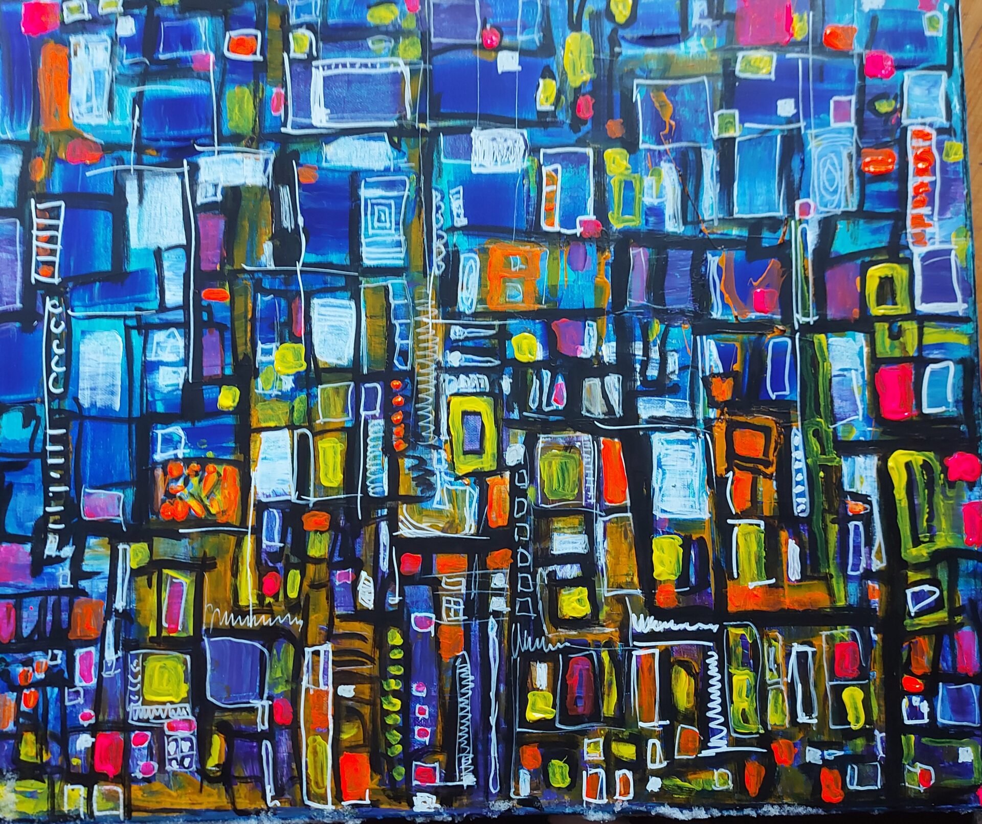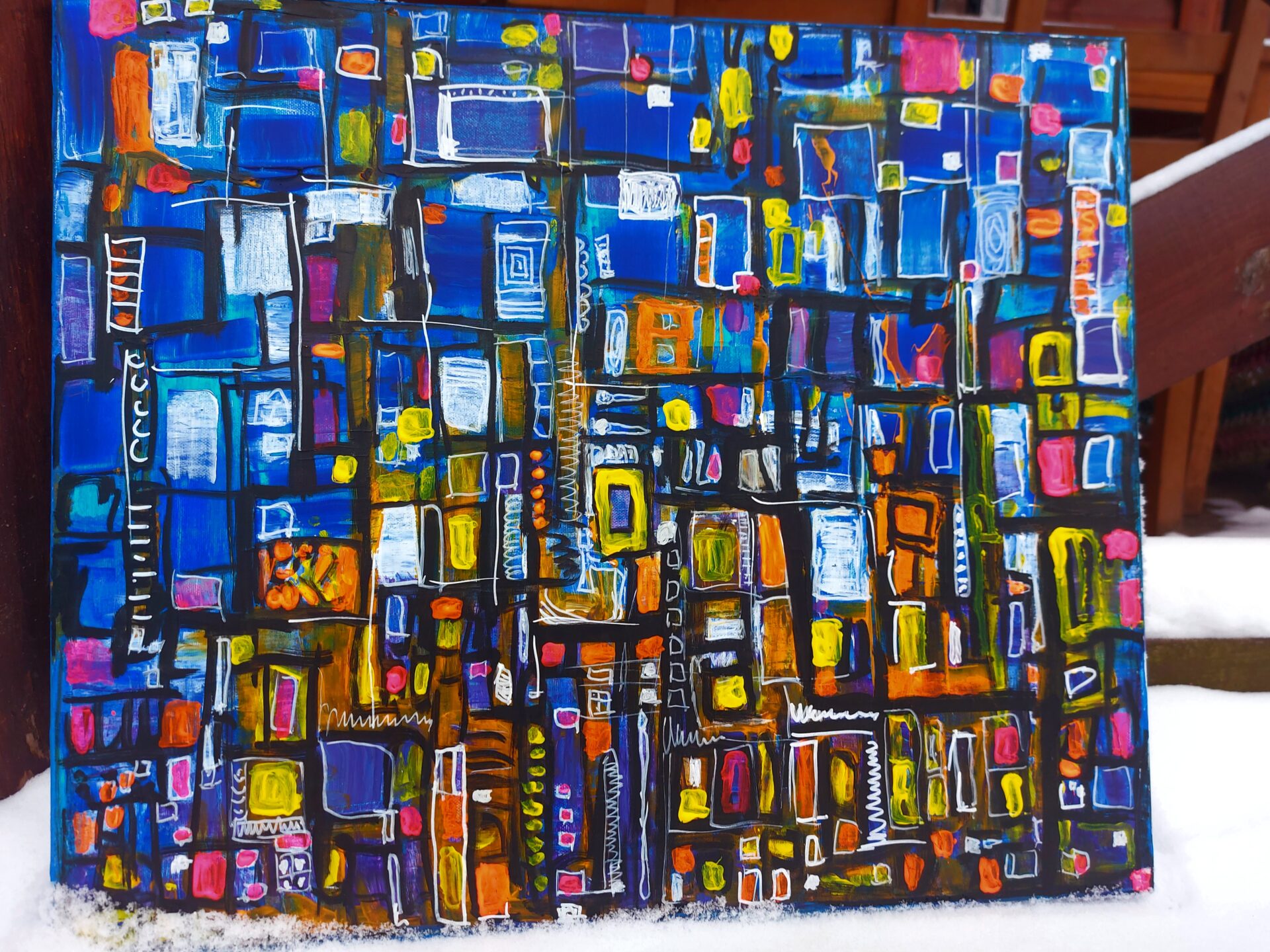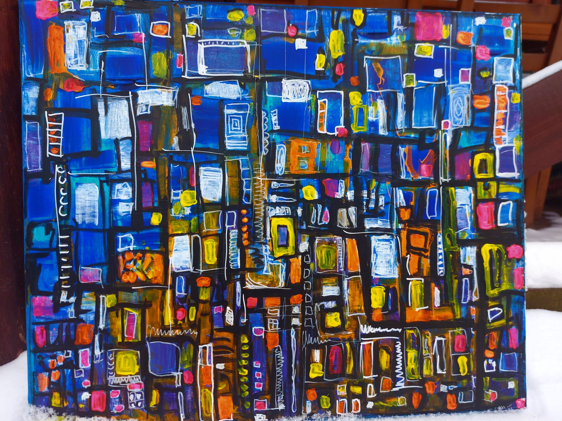 Miasto z lotu ptaka, wibrujące światła, mnóstwo świateł…Znaczenie zagubione między słowami. Relacja. Coś ważnego, a jednak NIEwypowiedzianego. Gwar. Tempo. Tętno. Wielkie miasto i mnóstwo świateł…O tym jest ten obraz.