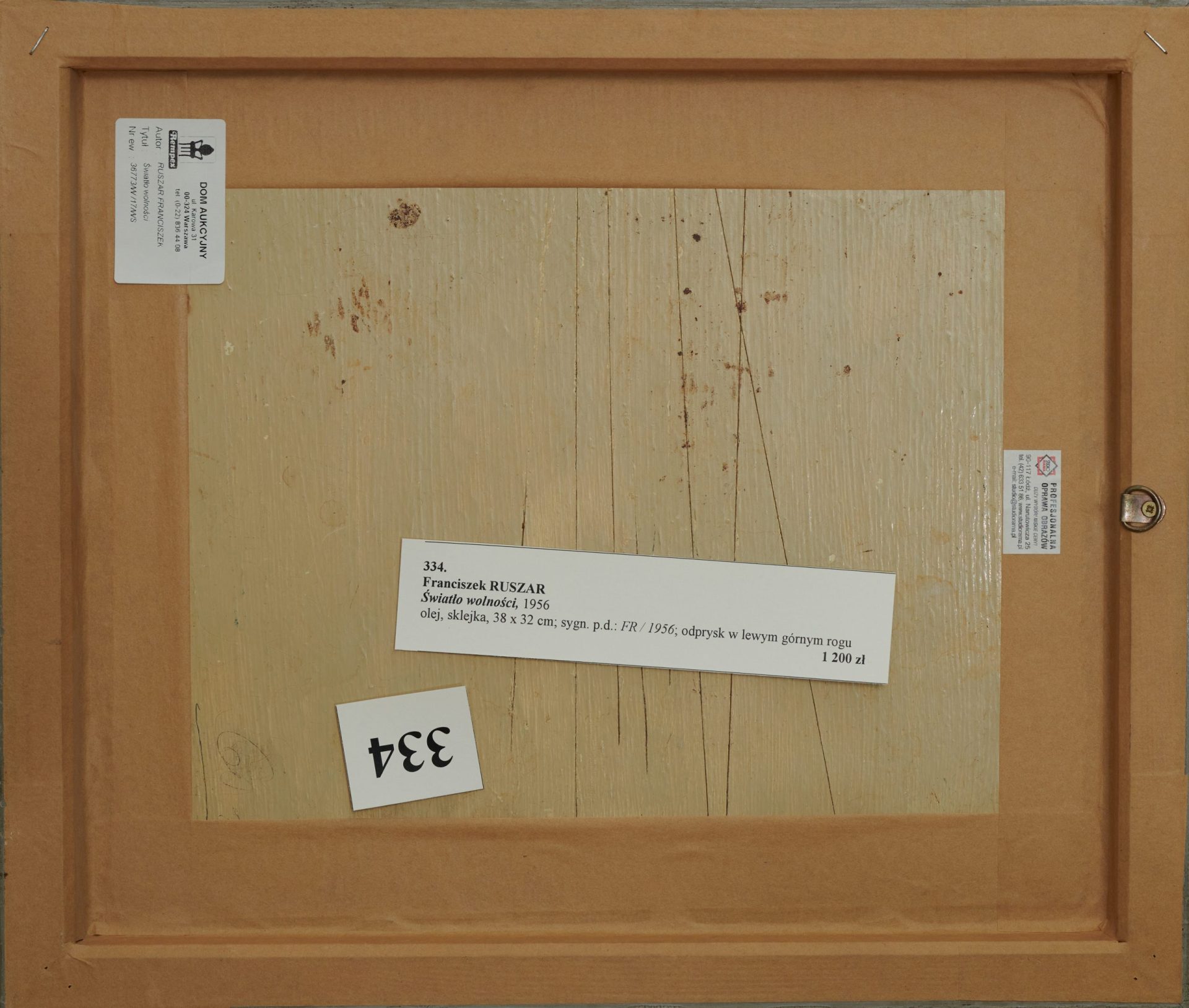 Obraz Franciszka Ruszar pod tytułem „Światło wolności” został wykonany w technice olejnej na sklejce w 1956 roku. Rozmiary 38 x 32 cm.