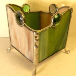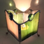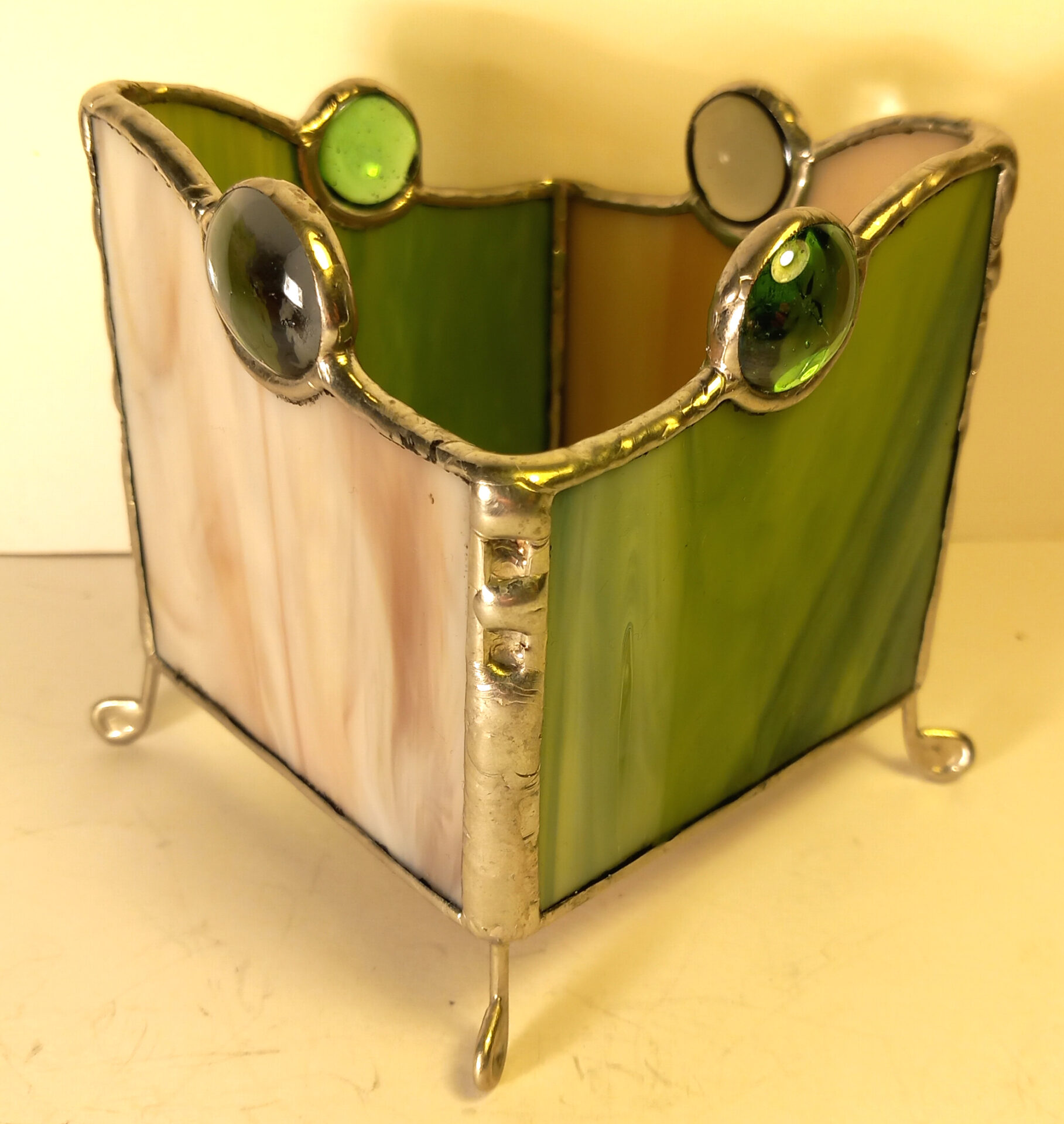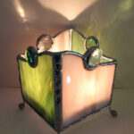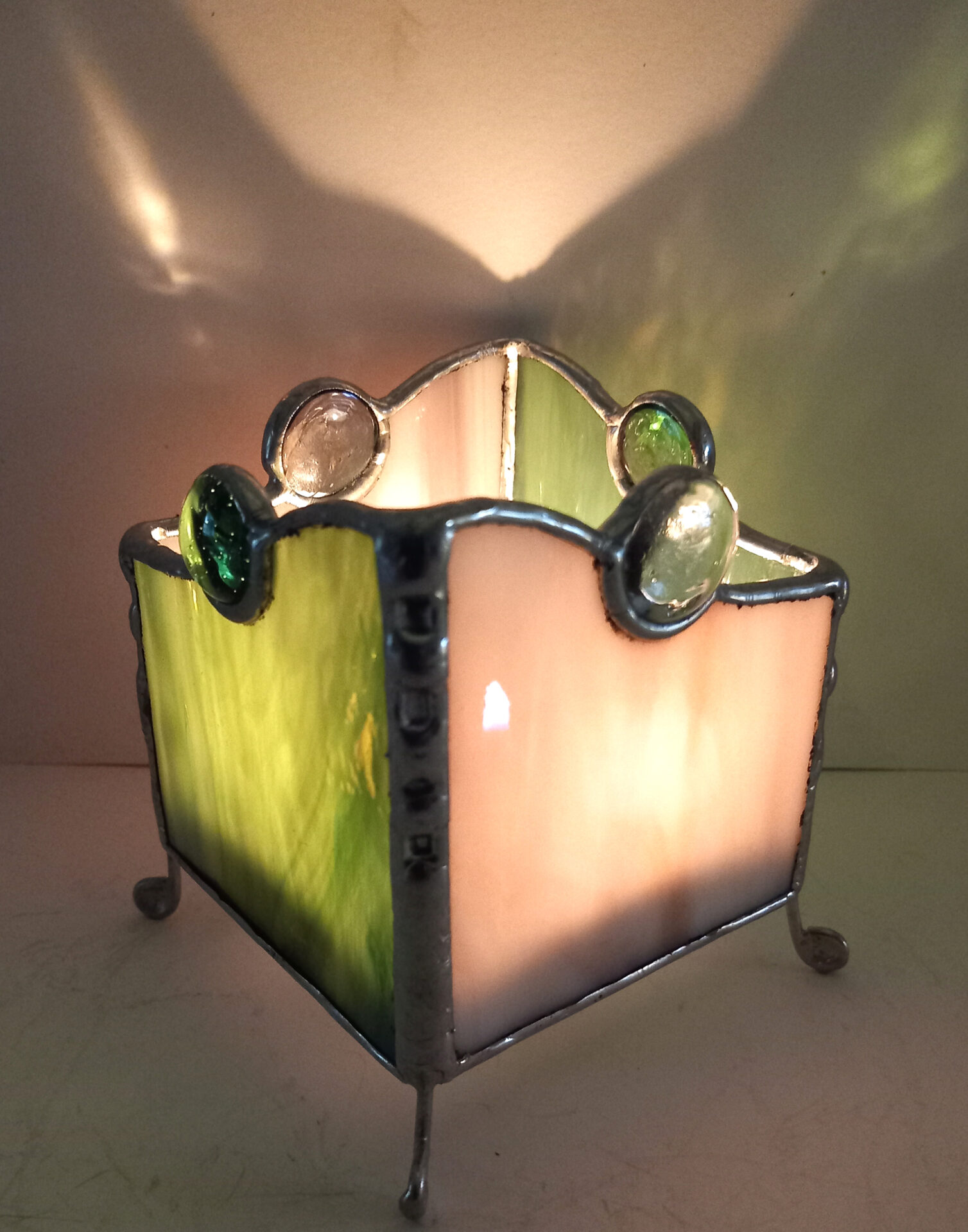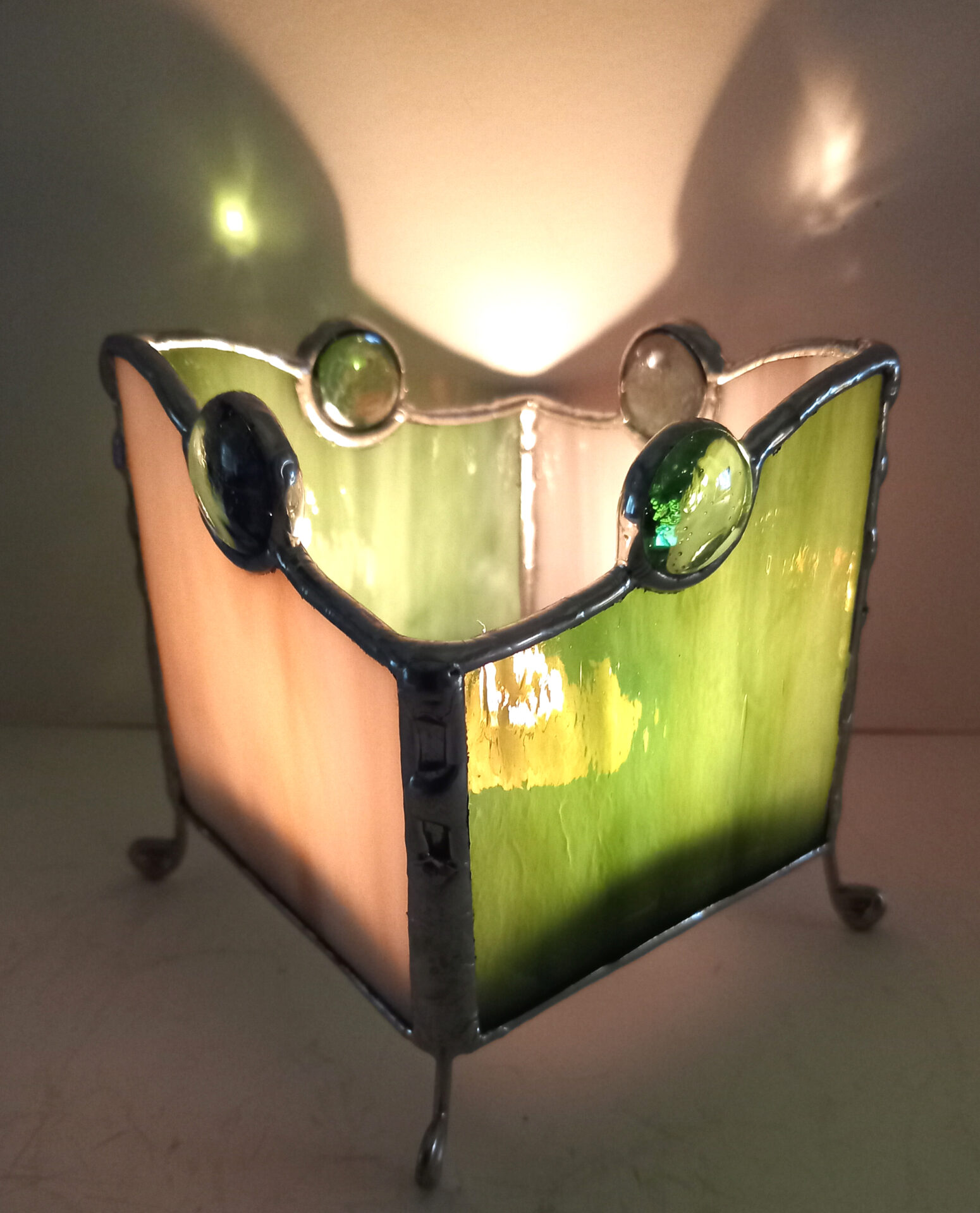Świecznik witrażowy wykonany w stu procentach ręcznie techniką Tiffany. Składa się z dziewięciu elementów szklanych (4 ścianki ze szkła witrażowego, 4 kaboszony i dno ze szkła bezbarwnego ornamentowego) i czterech metalowych nóżek. Na dnie świecznika przyklejona jest podkładka korkowa, która izoluje podgrzewacz (t-light) od szkła, co zapobiega jego pęknięciu od wysokiej temperatury stopionej stearyny.Wymiary: dno – 7,5 X 7,5 cm, wysokość (z nóżkami) – 9 cm.
