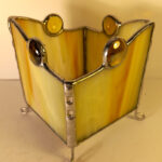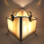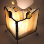 Świecznik witrażowy wykonany w stu procentach ręcznie techniką Tiffany. Składa się z dziewięciu elementów szklanych (4 ścianki ze szkła witrażowego, 4 kaboszony i dno ze szkła bezbarwnego ornamentowego) i czterech metalowych nóżek. Na dnie świecznika przyklejona jest podkładka korkowa, która izoluje podgrzewacz (t-light) od szkła, co zapobiega jego pęknięciu od wysokiej temperatury stopionej stearyny.Wymiary: dno – 7,5 X 7,5 cm, wysokość (z nóżkami) – 9 cm.