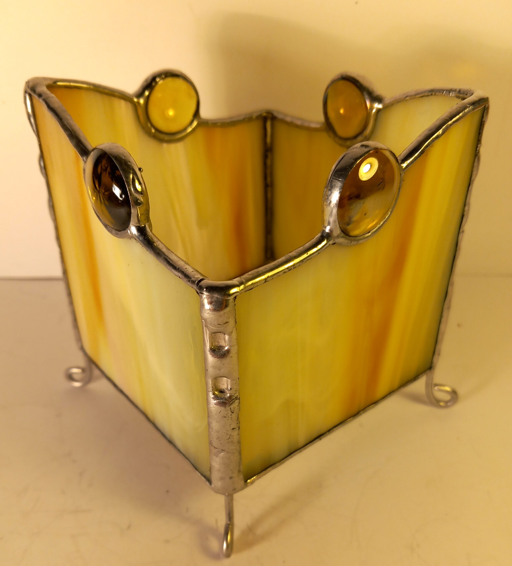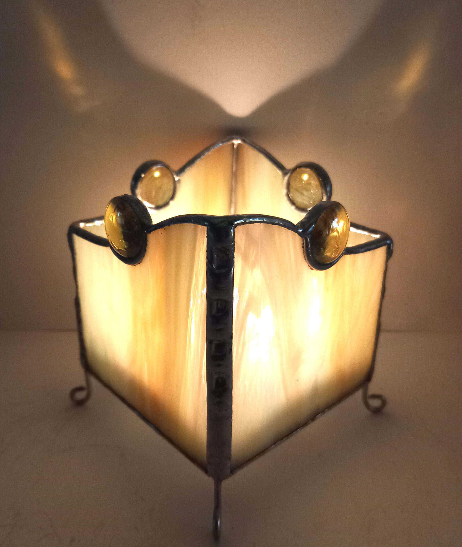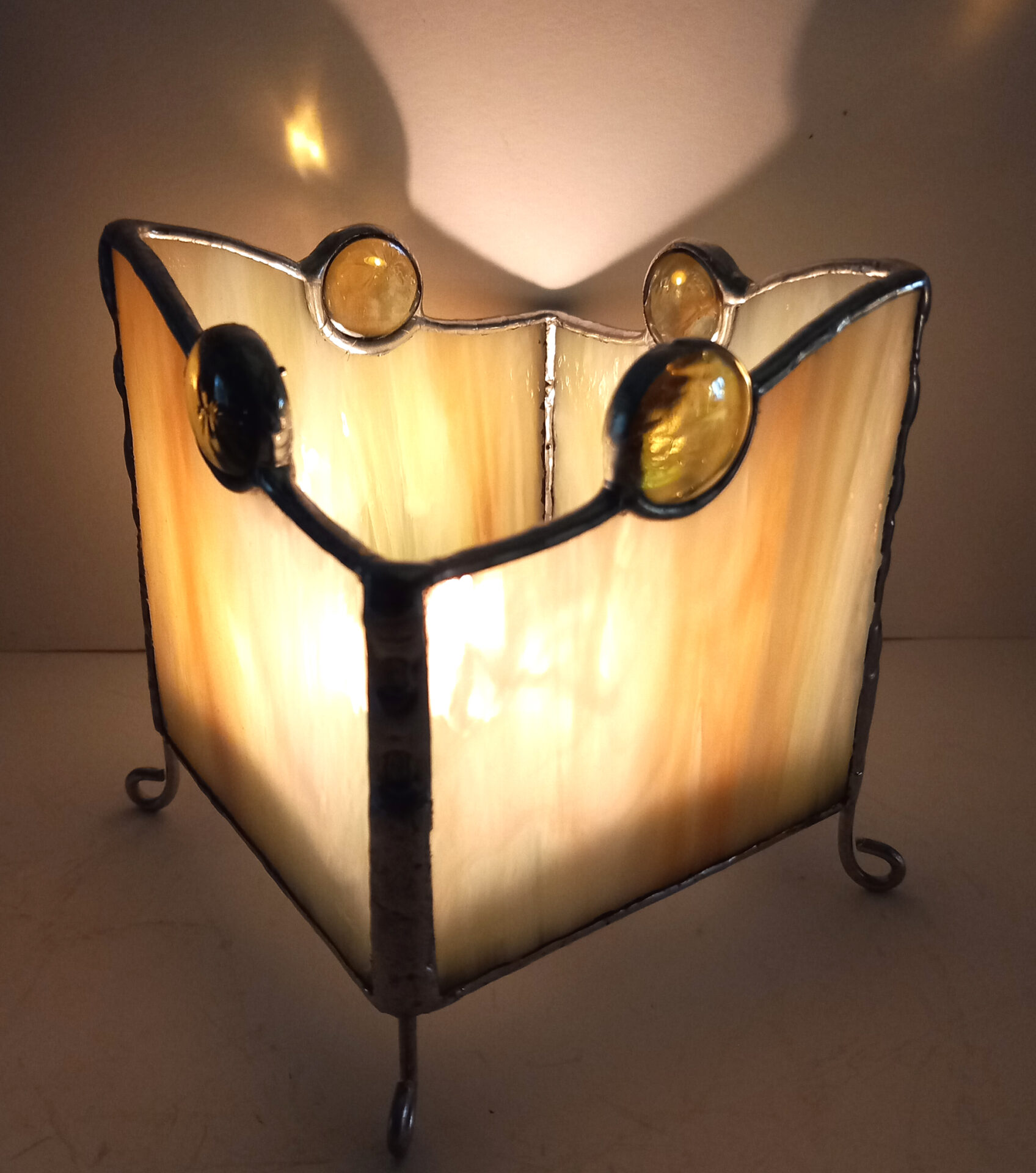 Świecznik witrażowy wykonany w stu procentach ręcznie techniką Tiffany. Składa się z dziewięciu elementów szklanych (4 ścianki ze szkła witrażowego, 4 kaboszony i dno ze szkła bezbarwnego ornamentowego) i czterech metalowych nóżek. Na dnie świecznika przyklejona jest podkładka korkowa, która izoluje podgrzewacz (t-light) od szkła, co zapobiega jego pęknięciu od wysokiej temperatury stopionej stearyny.Wymiary: dno – 7,5 X 7,5 cm, wysokość (z nóżkami) – 9 cm.