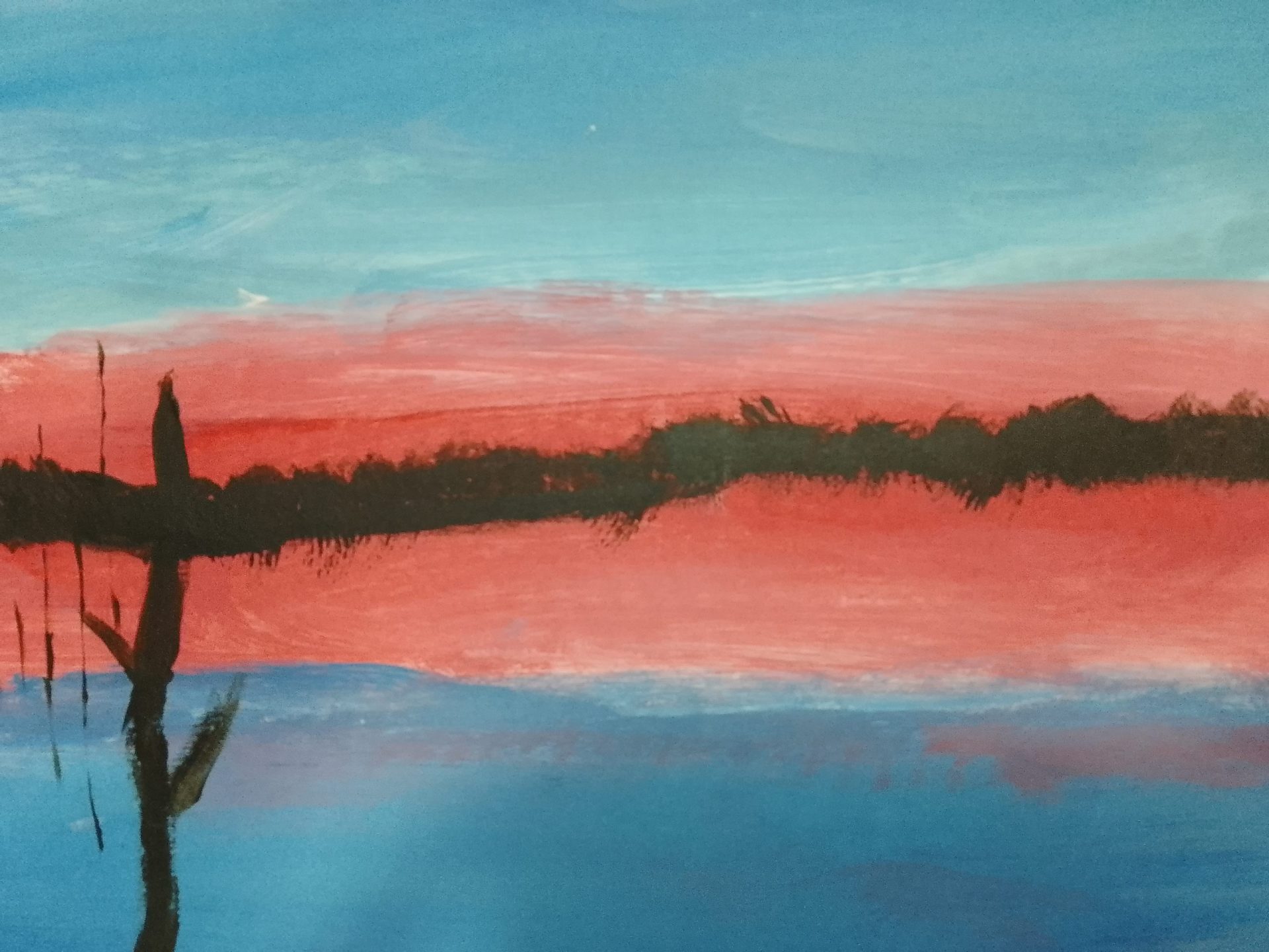 Obraz przedstawiający uroczysko Święte Ługi. Tuż przed zachodem słońca. Obraz został namalowany farbami akrylowymi.