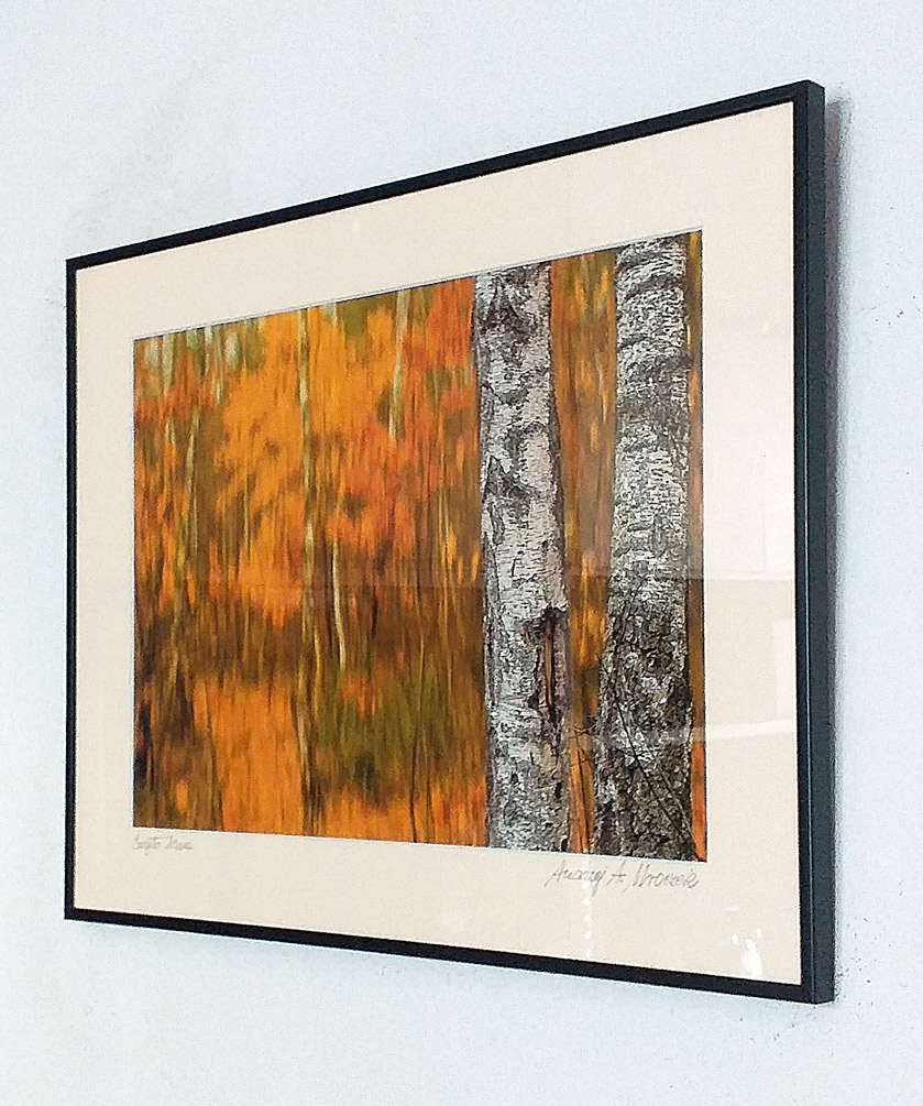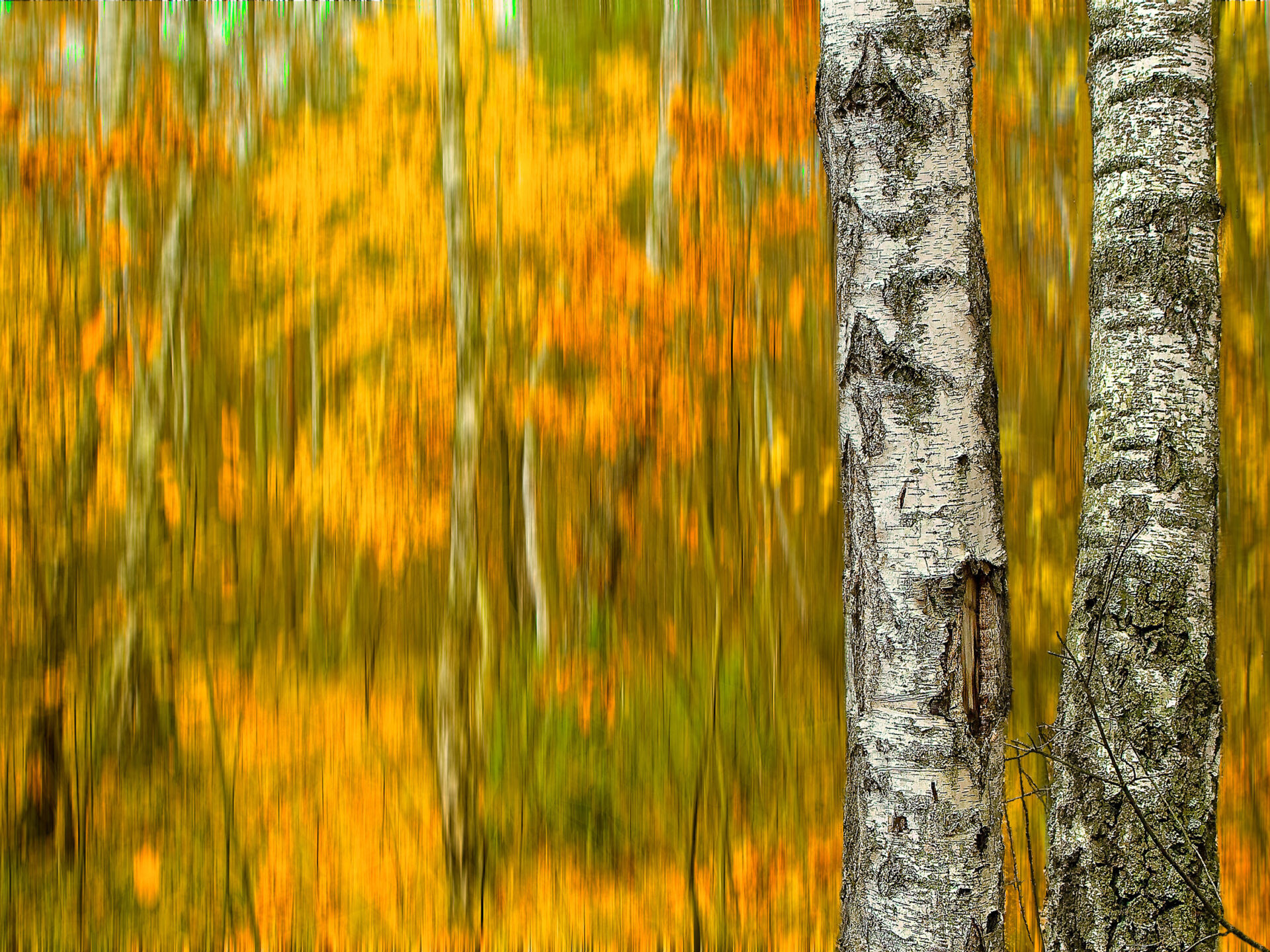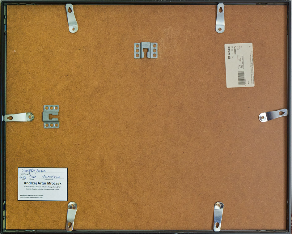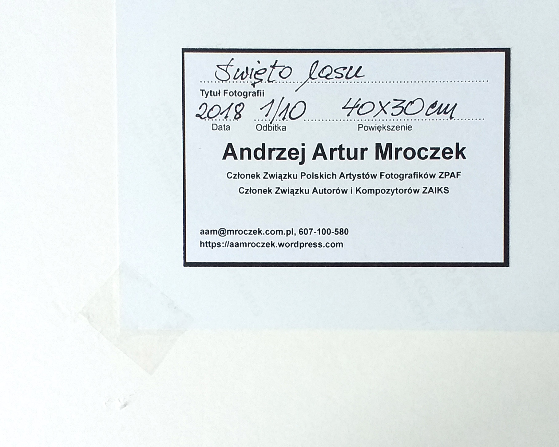 Święto lasu to fotografia zrobiona z jednego zdjęcia cyfrowego na którym zarówno pnie brzóz jak i tło z młodymi brzózkami było ostre. Ze względu na ciepłe barwy jesiennego listowia obraz był przyjemny, można by powiedzieć radosny i to mi nasunęło pomysł, żeby ten nastrój powiększyć. Zacząłem majstrować w programie Capture One, odrealniłem tło i przyszedł mi wtedy pomysł na tytuł tej fotografii: Święto lasu. A jak święto to zabawa i postanowiłem wprawić w ruch młode brzózki i na koniec powstała taka fotografia, którą tu przedstawiam. Oryginalny, pierwotny obraz , od którego wszystkie przemiany się zaczęły, dodaję w załączniku. Ponieważ nie potrafiłbym tego procesu powtórzyć na innym zdjęciu, więc z tego względu jest ona jedyna w swoim rodzaju. Oprawiłem ją w kremowe passe-partou oraz cienką czarną ramę + cienkie szkło – powiesiłem na ścianie w pokoju. Limit 1/5.