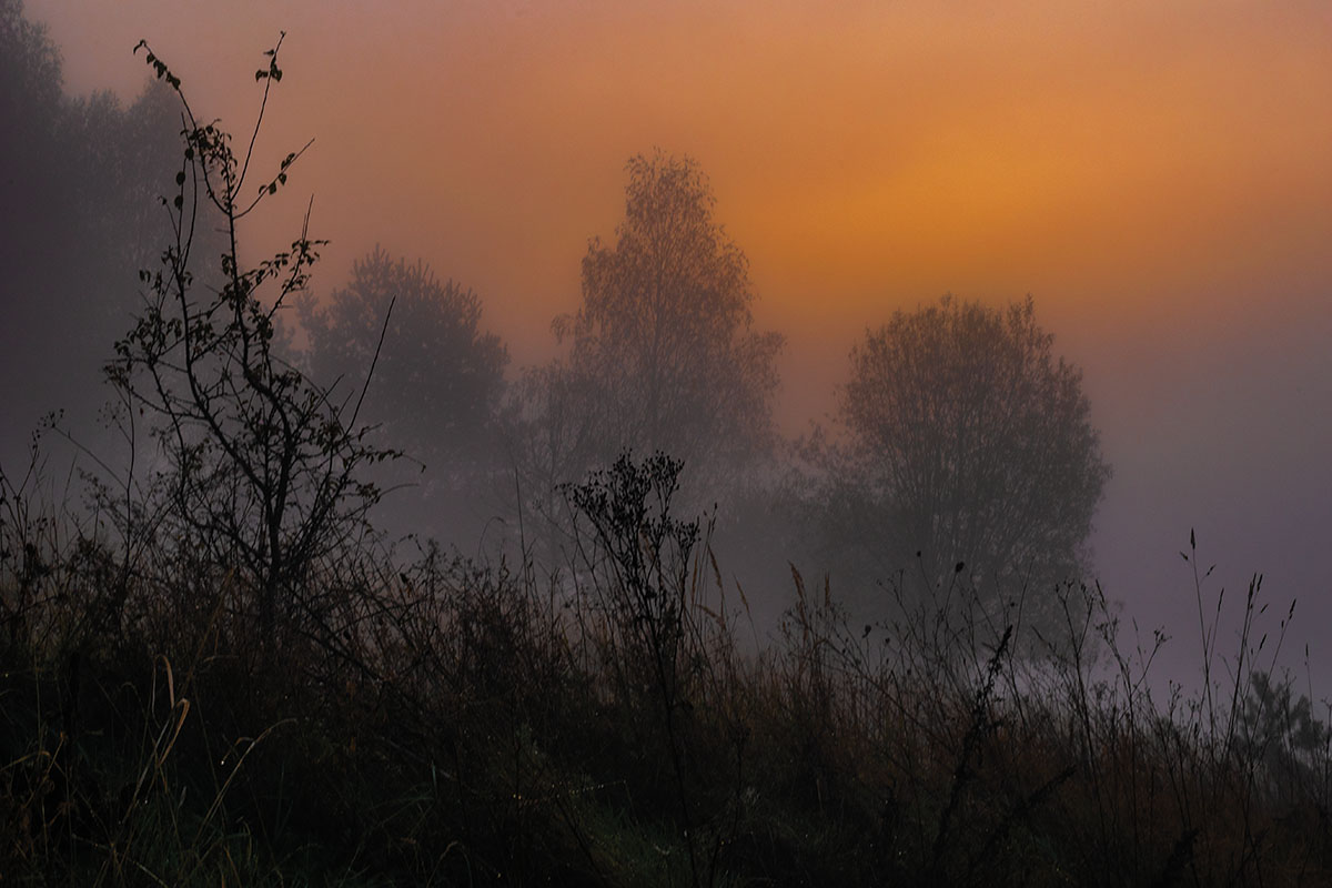 Pierwsze promienie wschodzącego nieśmiało przebijają się przez gęste zasłony mgieł, zabarwiając wszystko ciepłą poświatą.