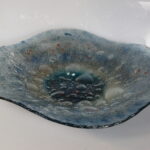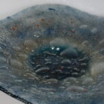 Misa o średnicy 38 cm wykonana techniką Fusingu ze szkła Flota, poprzez stopienie dwóch tafli szklanych, pomiędzy którymi znajduje się proszek barwiący oraz dający efekt bąbli.