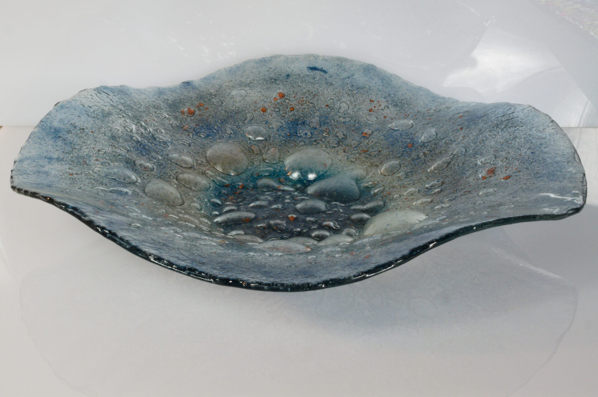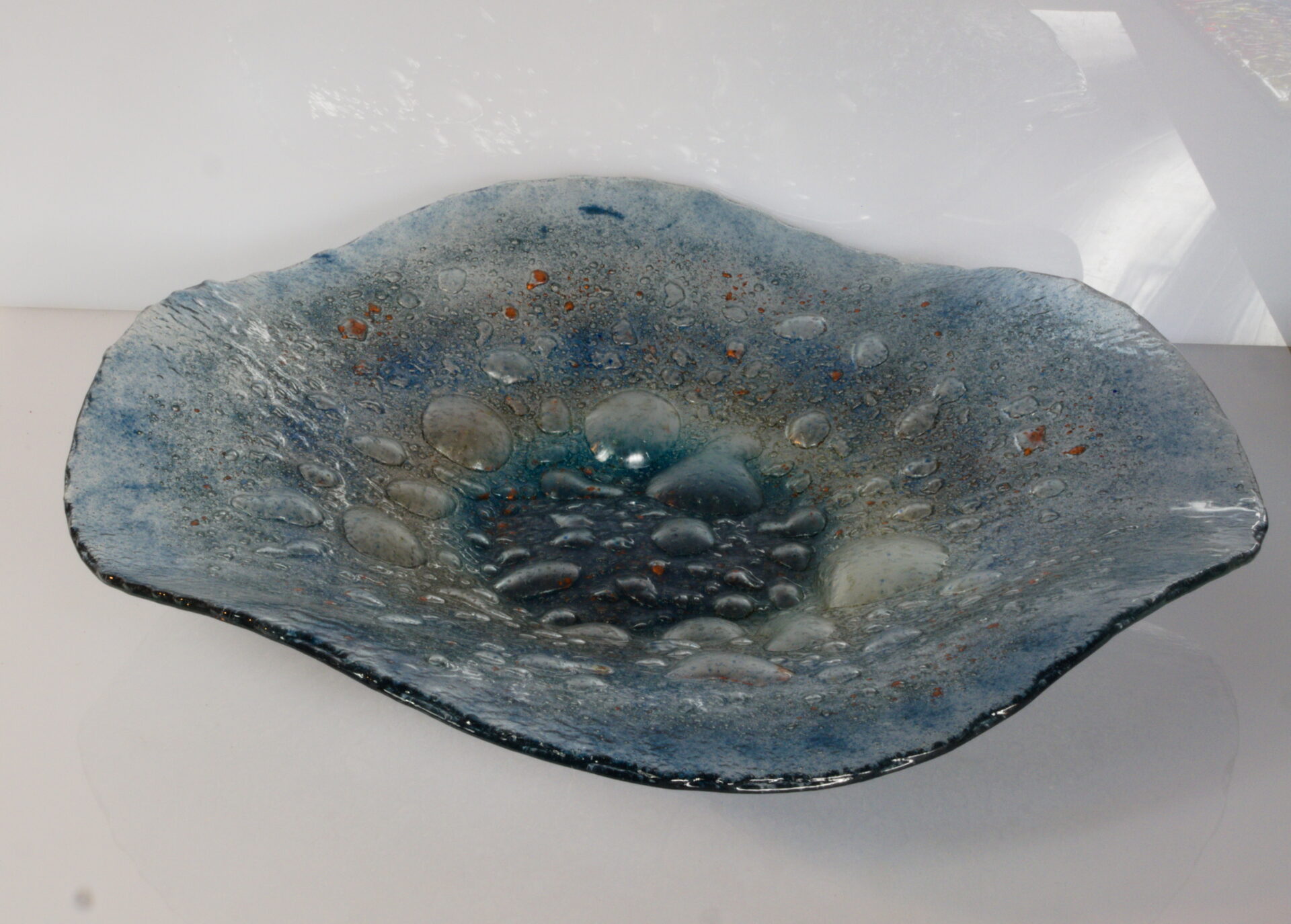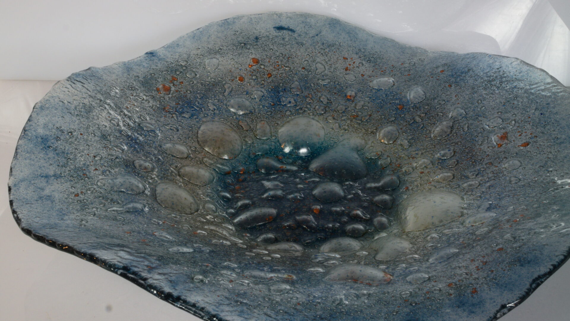 Misa o średnicy 38 cm wykonana techniką Fusingu ze szkła Flota, poprzez stopienie dwóch tafli szklanych, pomiędzy którymi znajduje się proszek barwiący oraz dający efekt bąbli.
