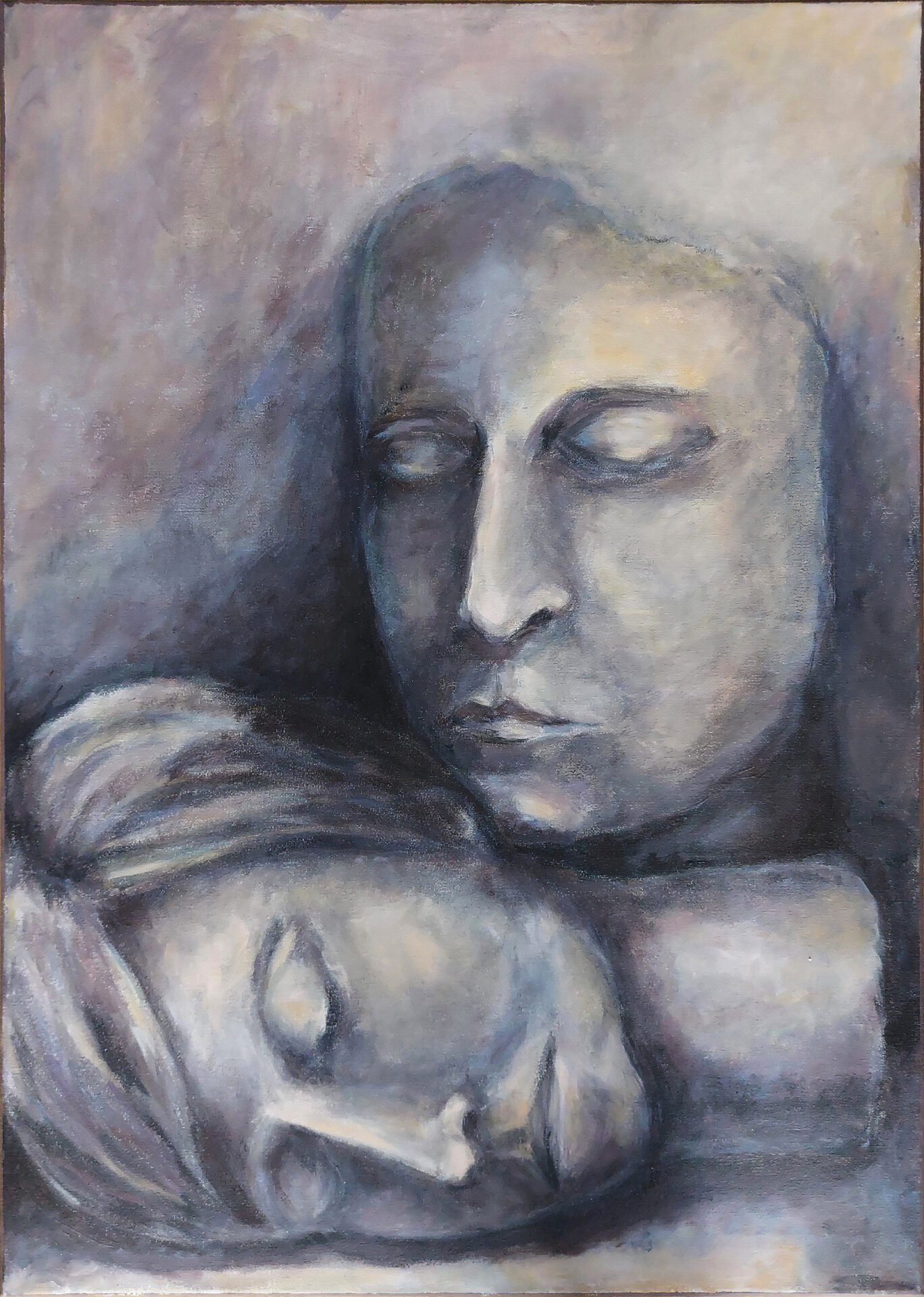 Inspiracją były rzeźbiarskie modele dwóch głów, które umieszczono w zupełnie różnych miejscach tej samej przestrzeni. Chciałam, aby zaistniały jakieś spersonalizowane relacje między nimi, dlatego na swoim obrazie umieściłam je obok siebie. I efekt okazał się zaskakujący! Między głowami powstała jakaś niesamowita więź, okryta metafizyczna tajemnicą.