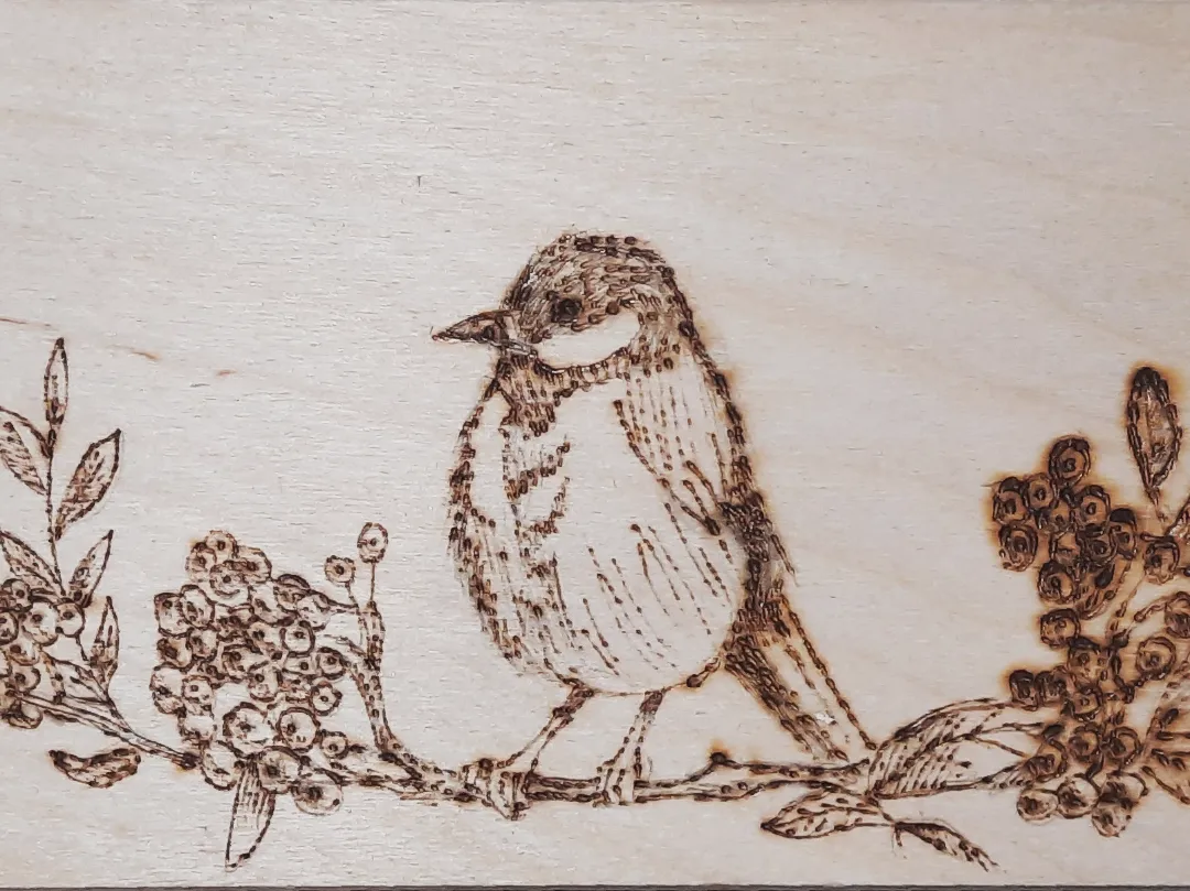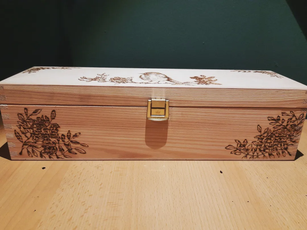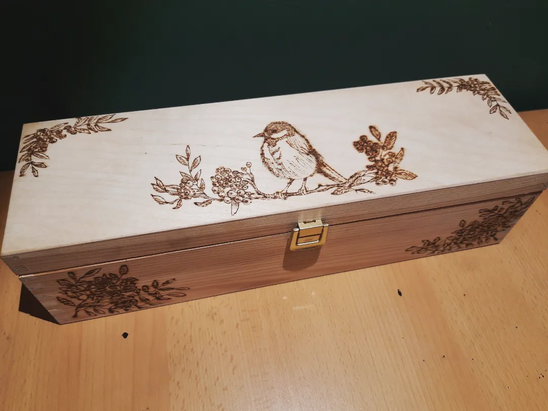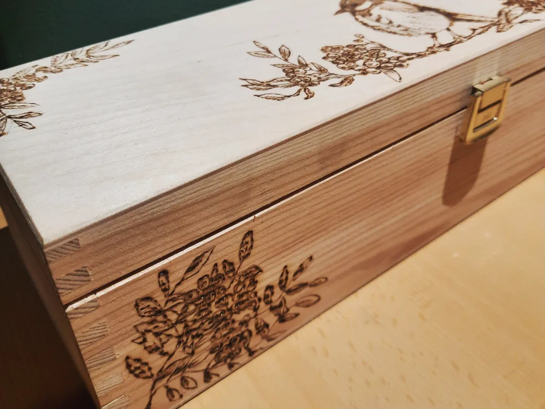 Szkatułka w roślinne motywy, wypalana ręcznie metodą pirografii