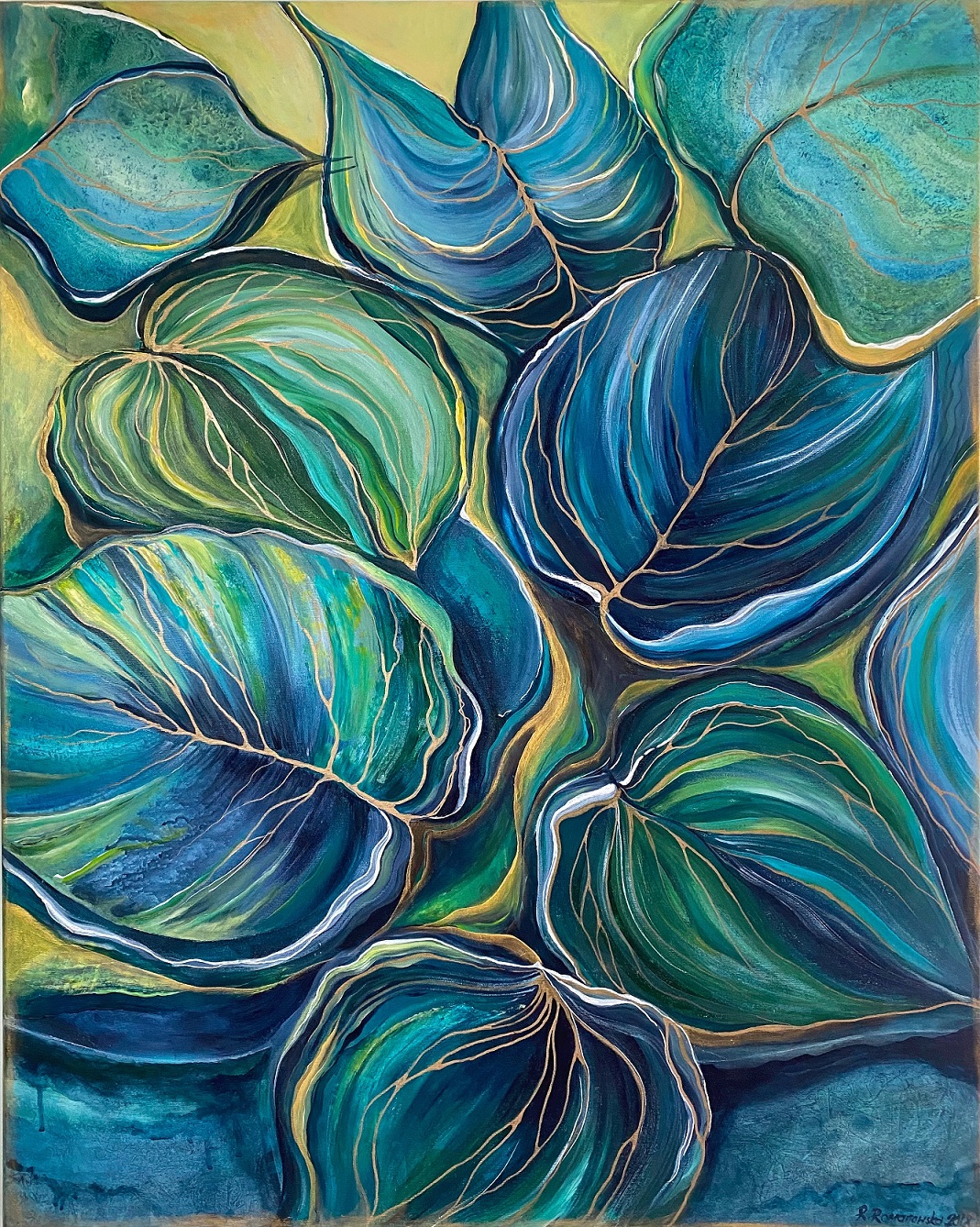 Obraz z modnym motywem tropikalnych liści, w odcieniu zielono-szmaragdowym, z odrobiną ciepłego złota, namalowany na podobraziu płóciennym o wymiarach 80×100 cm. Zabezpieczony werniksem. Boki obrazu zostały zamalowane dzięki czemu nie wymaga dodatkowej oprawy, jest gotowy do zawieszenia. Dodatkowo został zabezpieczony warstwą werniksu.