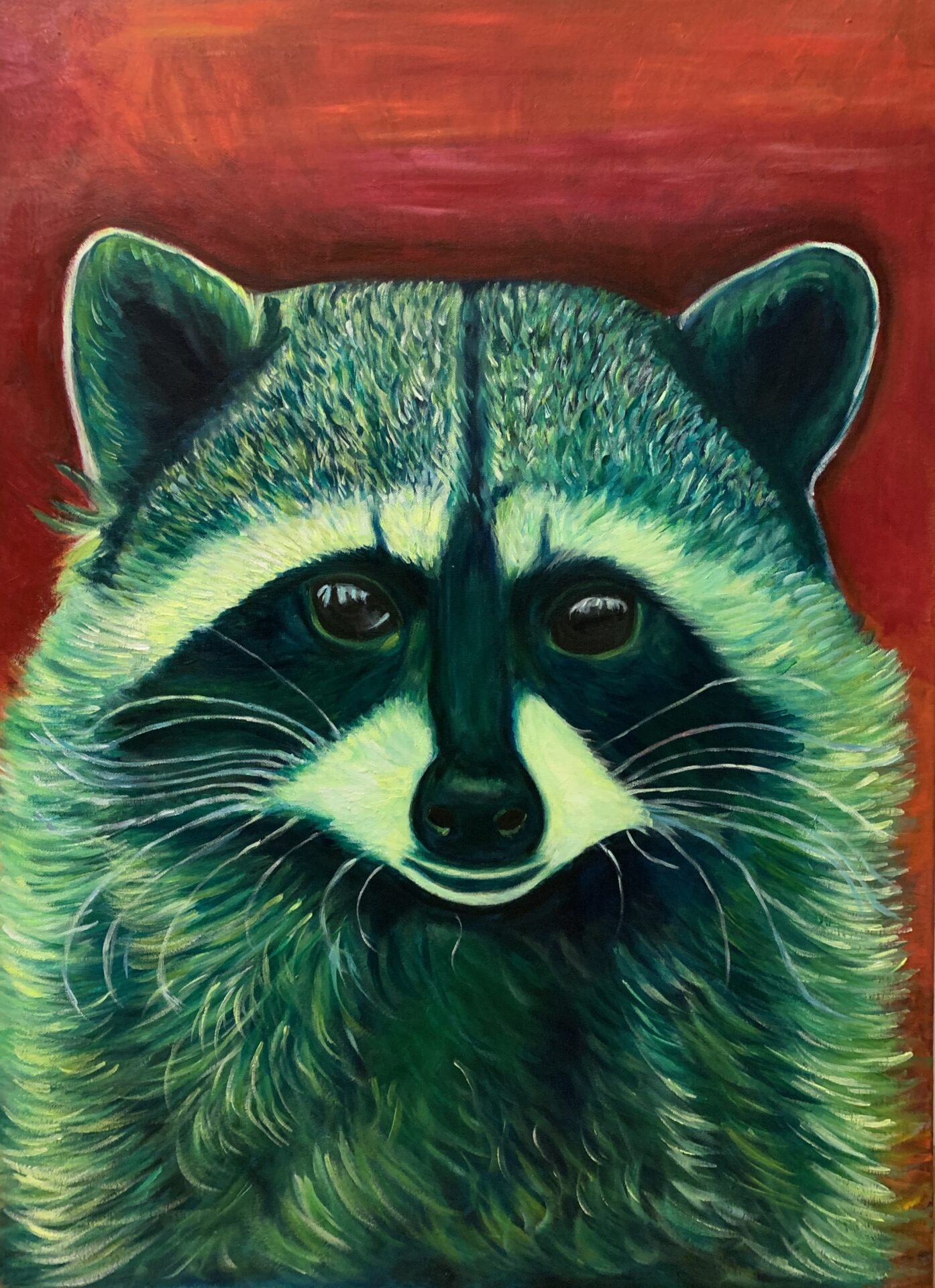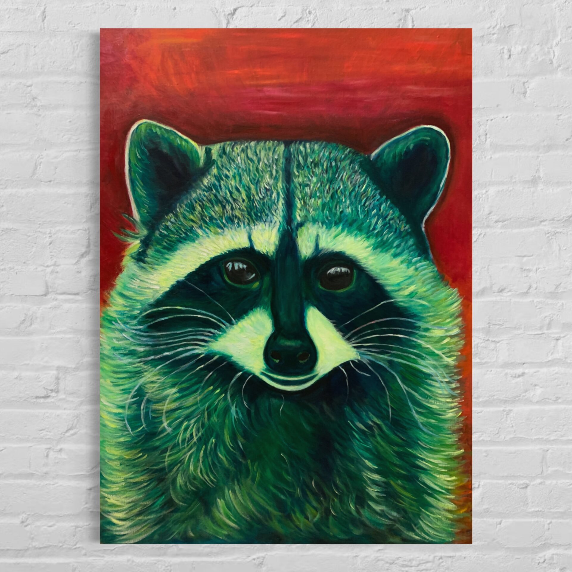 Unikatowy obraz szopa pracza namalowany ręcznie akrylami na płótnie przez Tpsy Painter (tpsypainter.pl).