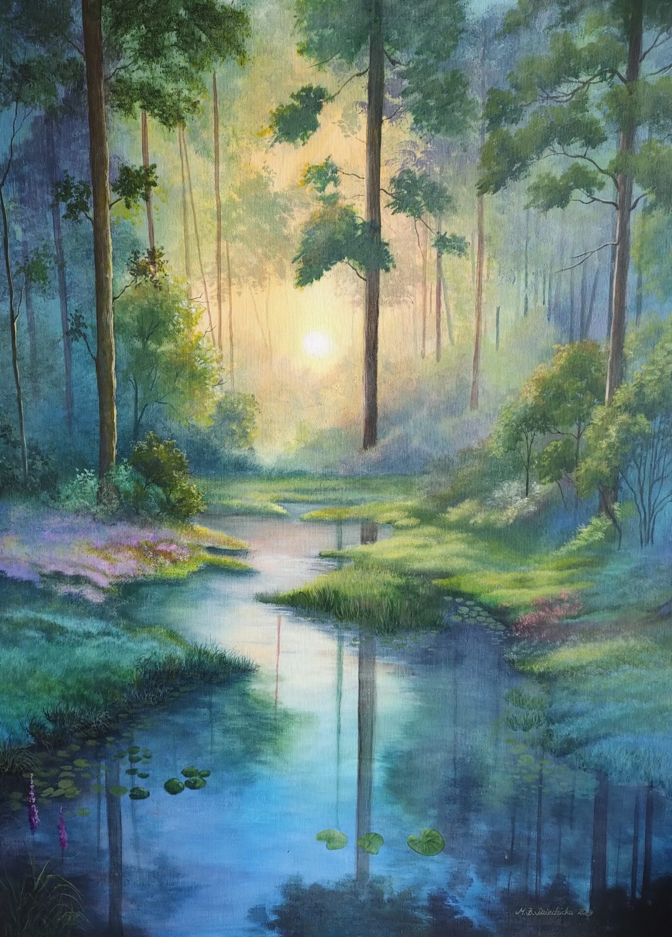 Obraz wykonany farbami akrylowymi na płycie malarskiej pokrytej płótnem. Wykończony werniksem z połyskiem, sygnowany na awersie i rewersie.