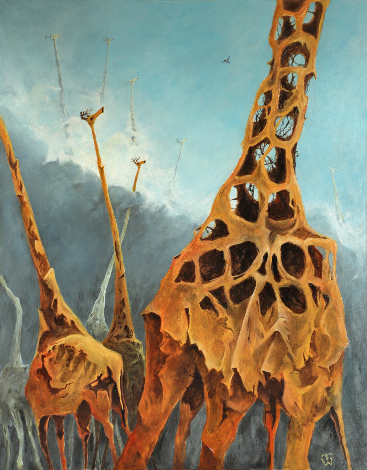 „Tam gdzie rosną żyrafie” – olej na płycie pilśniowej (gruntowanej gesso), wykończony werniksem olejowo żywicznym.