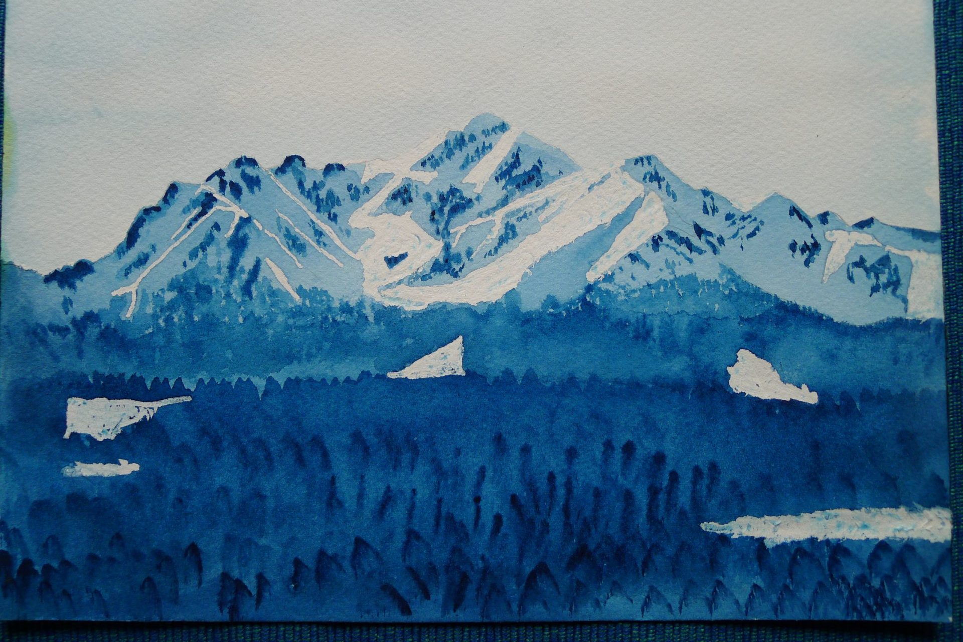 Praca wykonana farbami akwarelowymi na papierze do akwareli, sygnowana ołówkiem na odwrocie. Wykonana podczas wyjazdu narciarskiego przedstawia zimowy pejzaż górski w promieniach słonecznych. Punkt widzenia : Jurgów na polskim Spiszu, obraz przedstawia łańcuch Tatr Bielskich po słowackiej stronie.