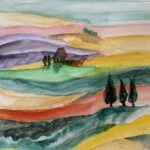 Akwarela namalowana na papierze 300g formatu A4. Prezentuje wielokolorowy krajobraz toskański . Obraz radosny w żywych kolorach.