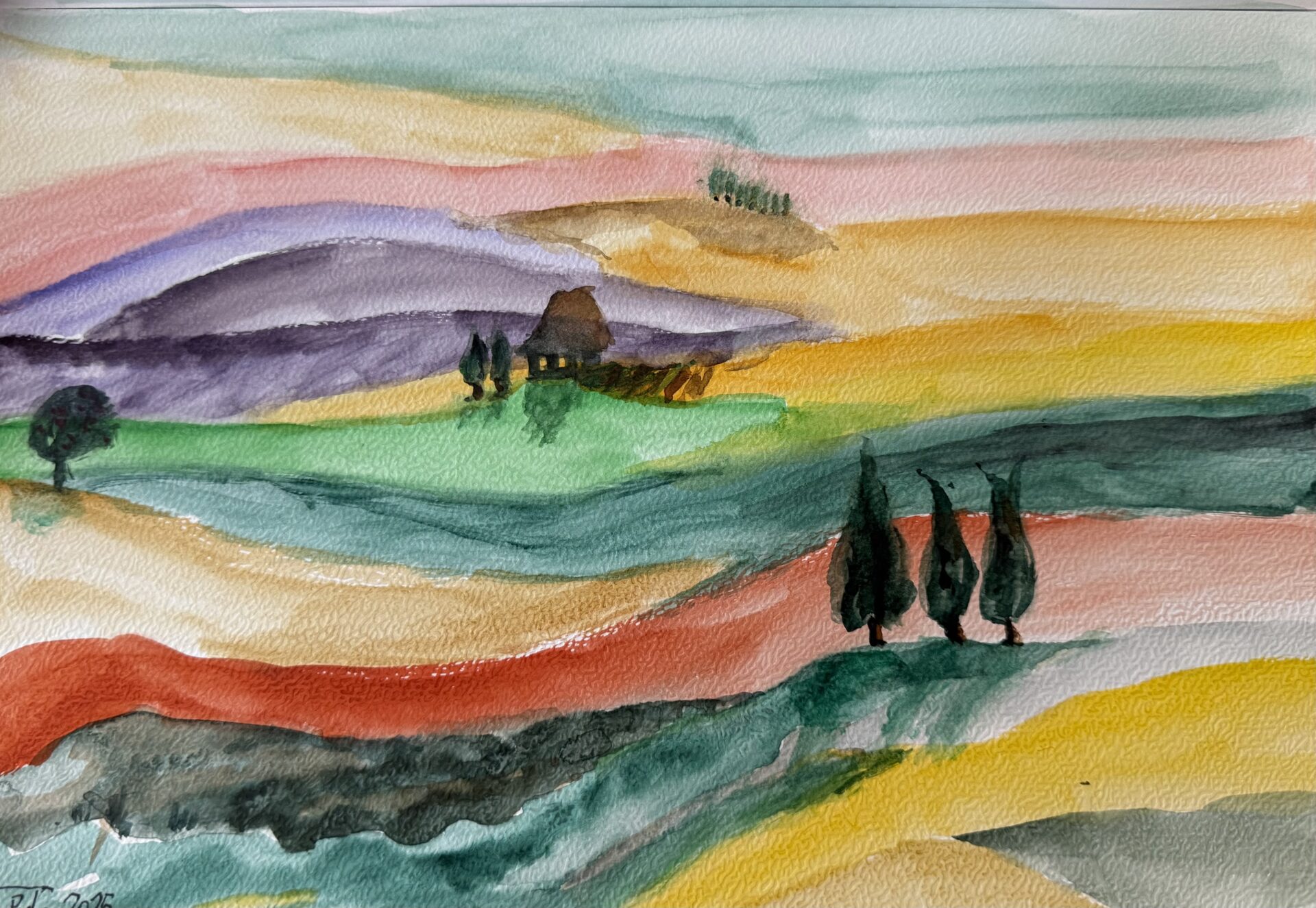 Akwarela namalowana na papierze 300g formatu A4. Prezentuje wielokolorowy krajobraz toskański . Obraz radosny w żywych kolorach.