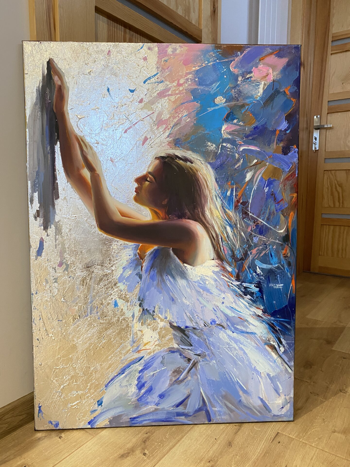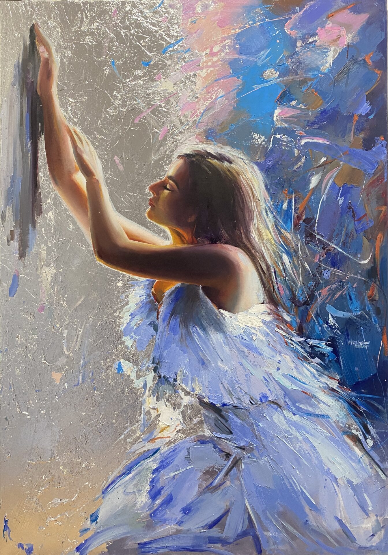 • Obraz malowany farbami olejnymi na płótnie bawełnianym z dodatkiem płatków srebra, o wymiarze 100x70cm, rok wykonania 2024.