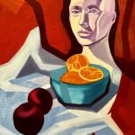 Dzieło przedstawia białą, plastikową makietę ludzkiej głowy oraz owoce, w losowy sposób porozrzucane na błękitnej tkaninie. Tło zakomponowane zostało z jednolitych plam pomarańczu oraz głębokiej czerwieni, które tworzą wyraźną strukturę, układając się w całość i dopasowując się do siebie nawzajem. Obraz malowany na wysokojakościowym płótnie włoskim w technice farb olejnych. Geometryczny i wielobarwny wyraz dzieła, sprawia, że doskonale wpisuje się ono w nowoczesne, minimalistyczne wnętrze. Obraz bezramowy. Oryginał. Dokument autentyczności wydany przez artystę.