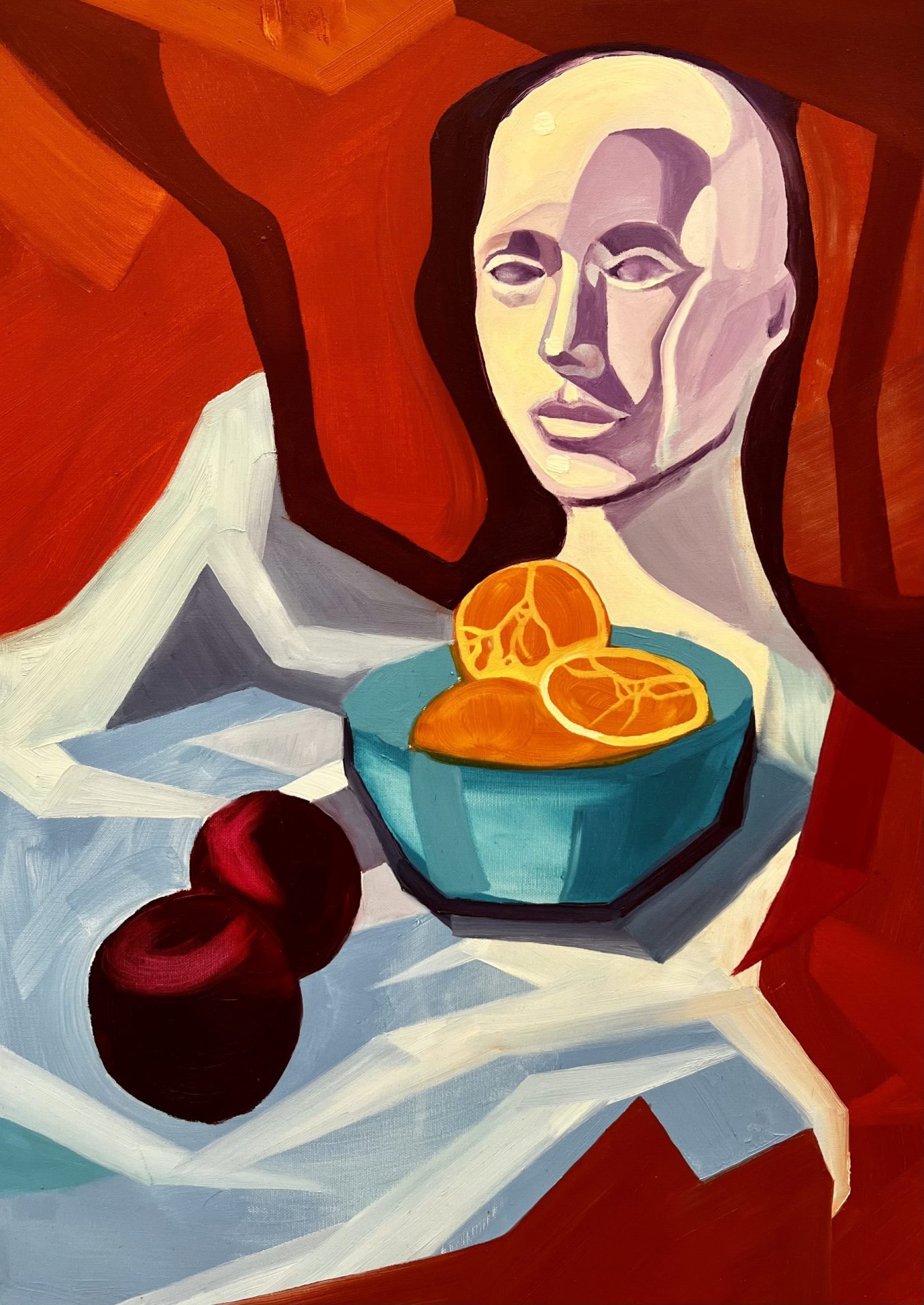 Dzieło przedstawia białą, plastikową makietę ludzkiej głowy oraz owoce, w losowy sposób porozrzucane na błękitnej tkaninie. Tło zakomponowane zostało z jednolitych plam pomarańczu oraz głębokiej czerwieni, które tworzą wyraźną strukturę, układając się w całość i dopasowując się do siebie nawzajem. Obraz malowany na wysokojakościowym płótnie włoskim w technice farb olejnych. Geometryczny i wielobarwny wyraz dzieła, sprawia, że doskonale wpisuje się ono w nowoczesne, minimalistyczne wnętrze. Obraz bezramowy. Oryginał. Dokument autentyczności wydany przez artystę.
