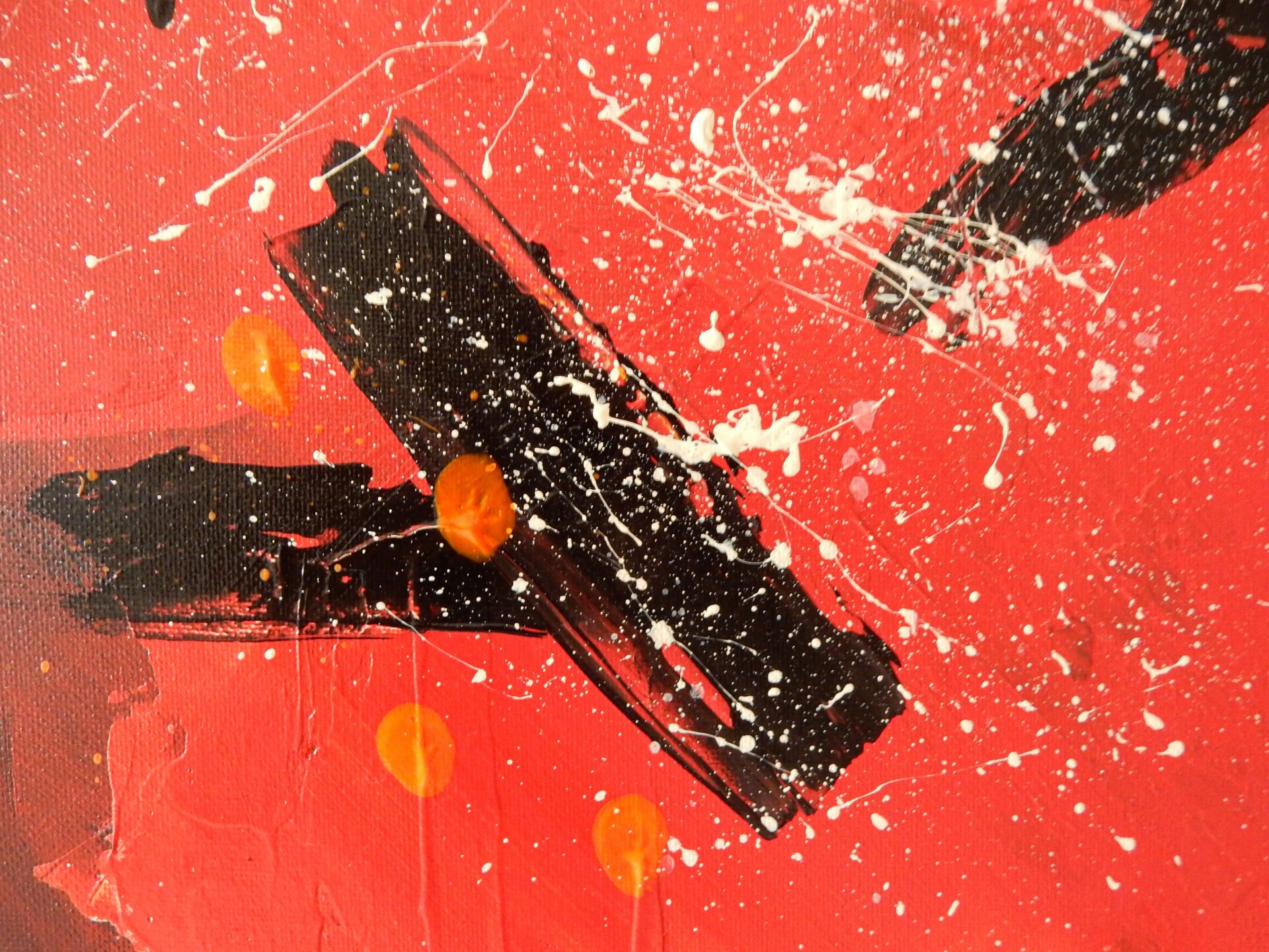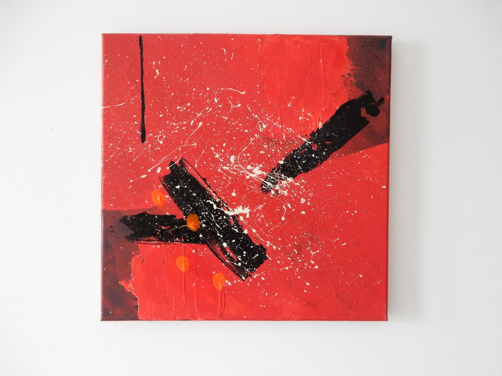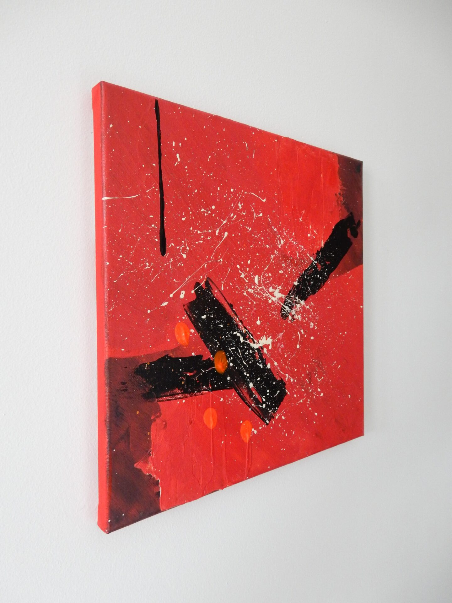 Informacje podstawowe: akryl na płótnie bawełnianym (gruntowanym)30×30 cm. Barwy: czerwień, biel, czerń i pomarańcz. Boki czerwone.
