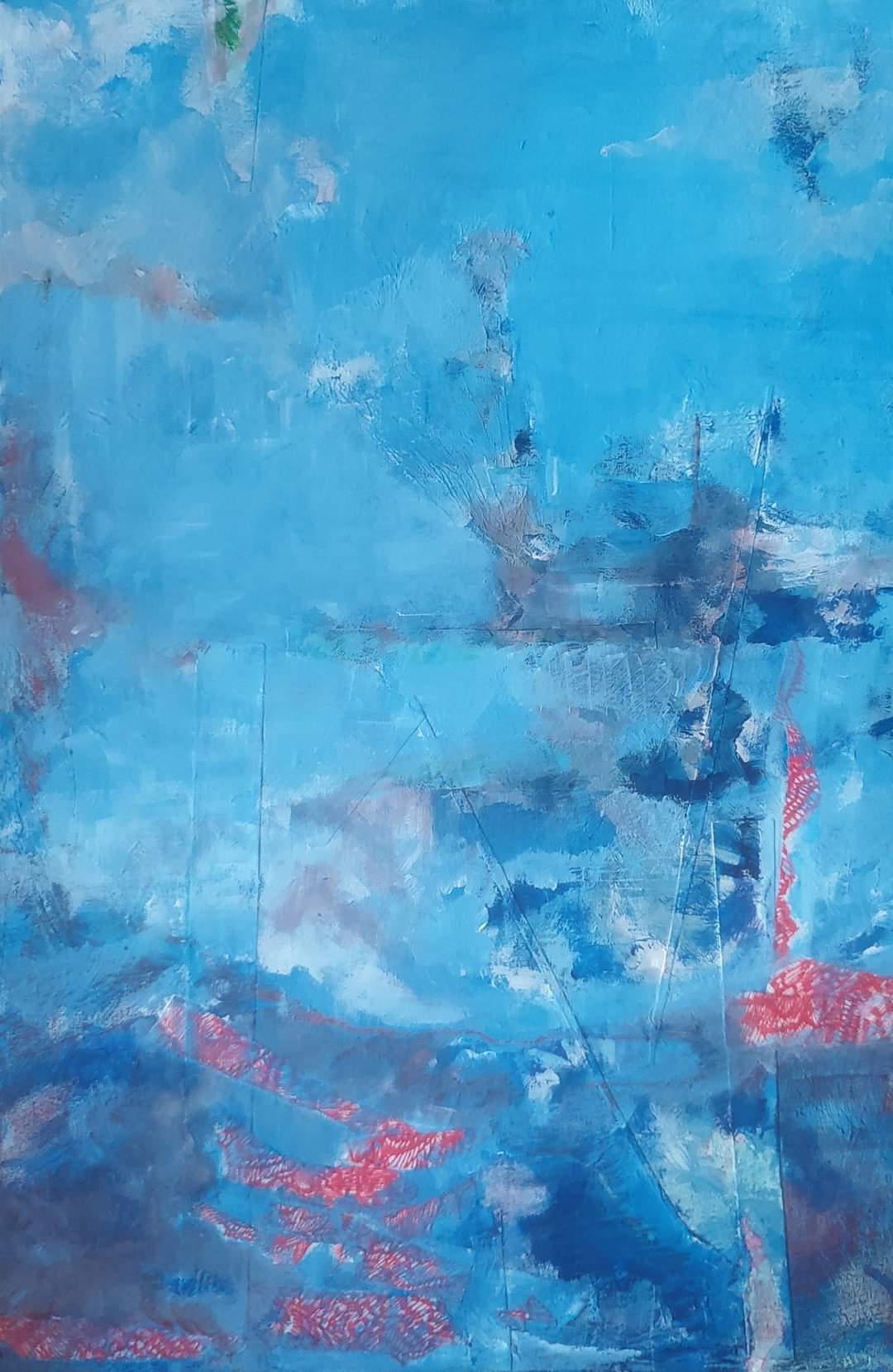 Technika mieszana (akryl, farba do ścian, papier, cienkopis) na podobraziu, 60×40 cm.