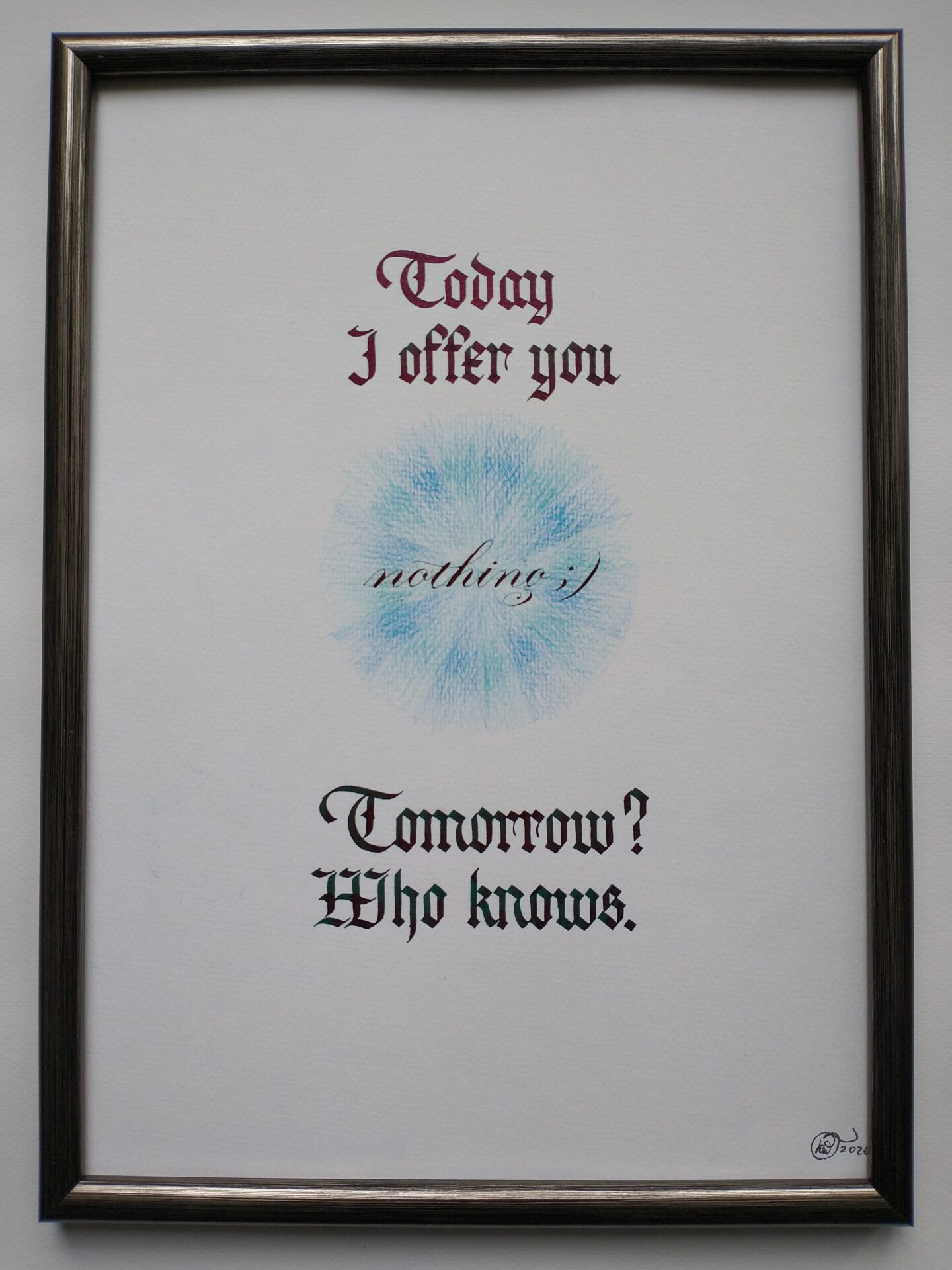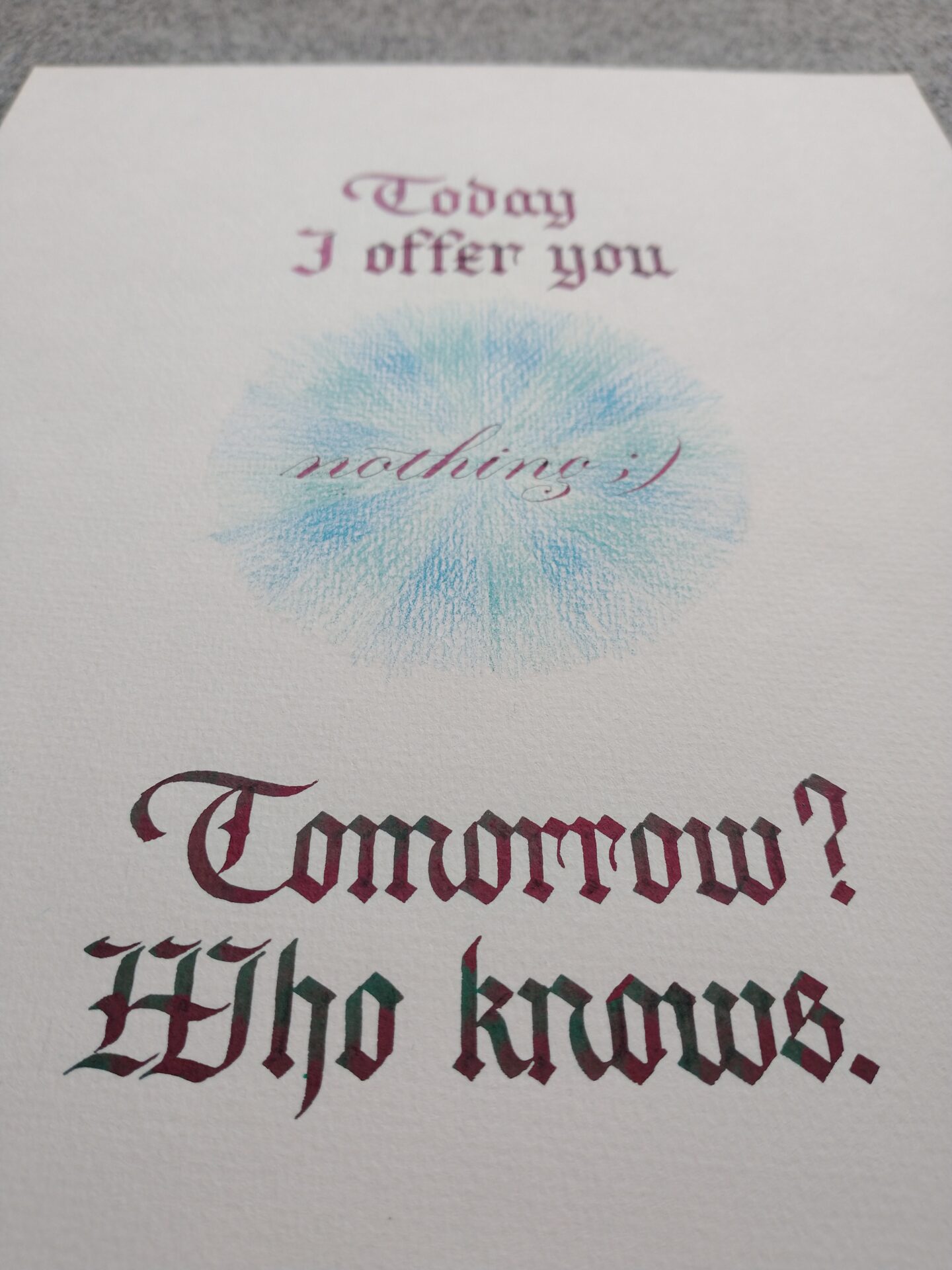Kaligrafia z elementami graficznymi – dwukolorowy tusz i kredki na papierze akwarelowym, format A4 w orientacji pionowej.