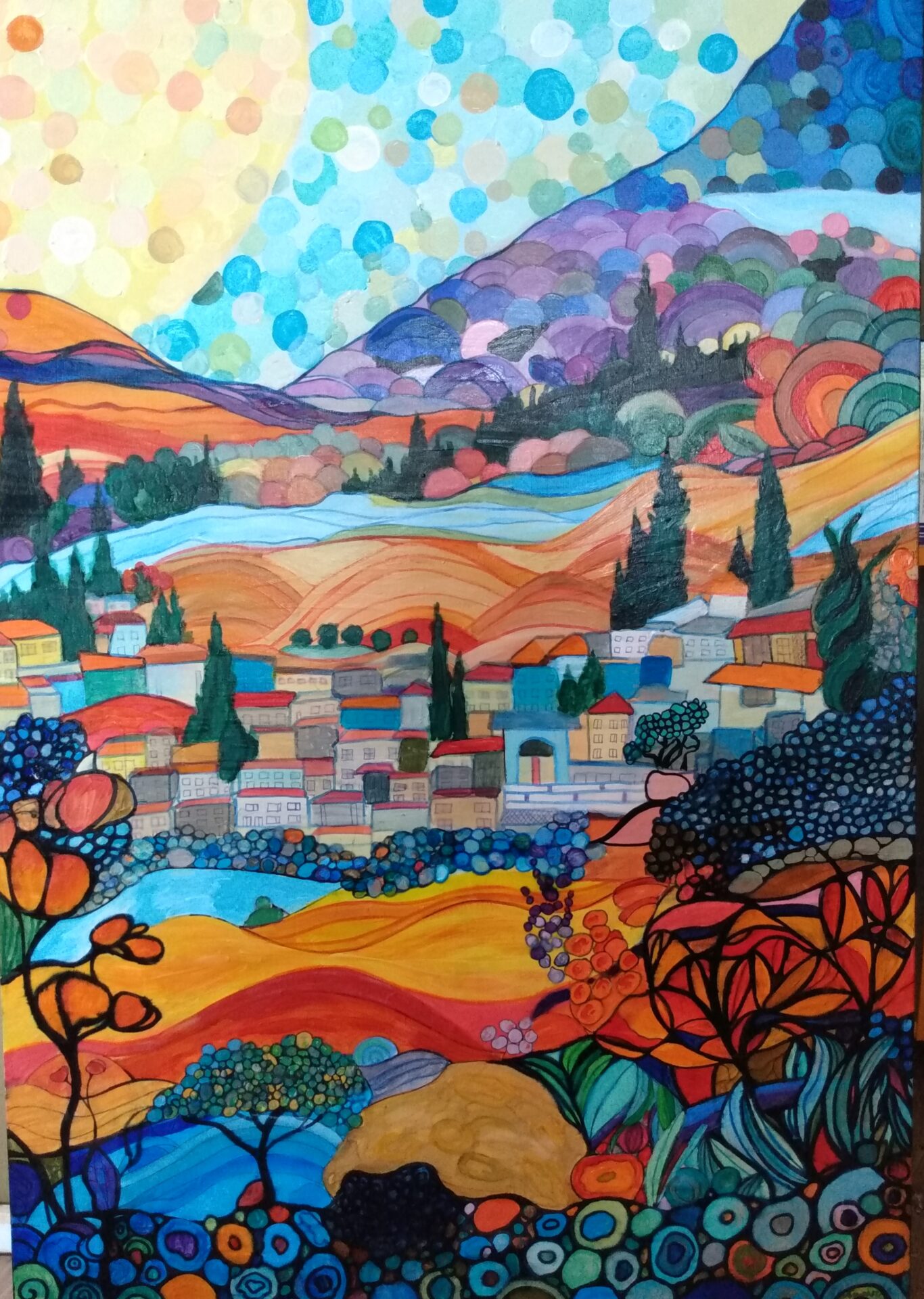 Bardzo pozytywny i energetyczny pejzaż. Inspirowany pracami Van Gogha.Wyraźna faktura farby. Werniksowany. Obraz w technice akrylowej na płótnie. Wymiar 100×70. Brzegi zamalowane.