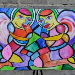 Obraz o wymiarach 115/75. Malowany farbą akrylowa oraz farba olejną, nie wymaga oprawy, zamalowane boki. Praca zatytułowana „Troskliwe Anioły” jest to propozycja inna niż standardowe Anioły. Kolorystyka żywa, rzucająca się w oczy.