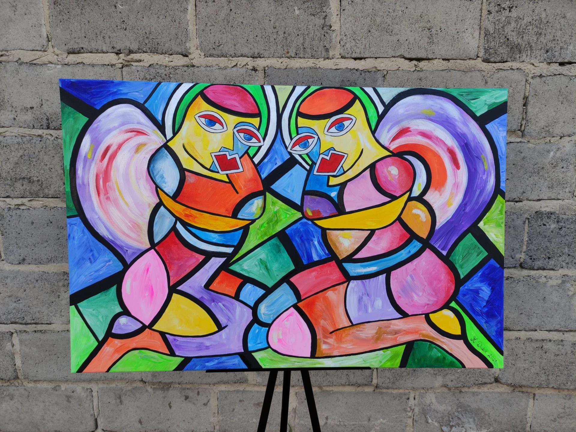 Obraz o wymiarach 115/75. Malowany farbą akrylowa oraz farba olejną, nie wymaga oprawy, zamalowane boki. Praca zatytułowana „Troskliwe Anioły” jest to propozycja inna niż standardowe Anioły. Kolorystyka żywa, rzucająca się w oczy.