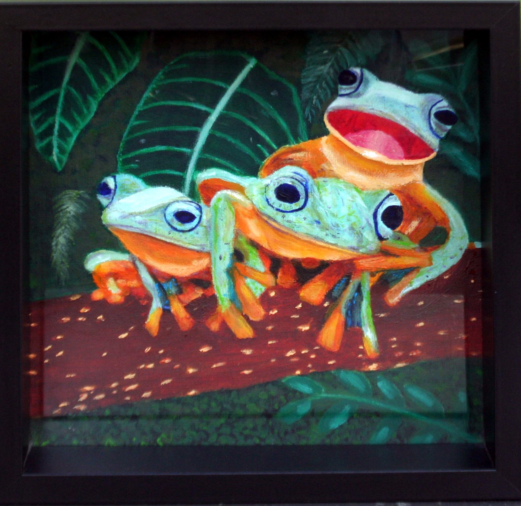 Obraz olejny na panelu przedstawia trzy amazońskie żabki na gałęzi.