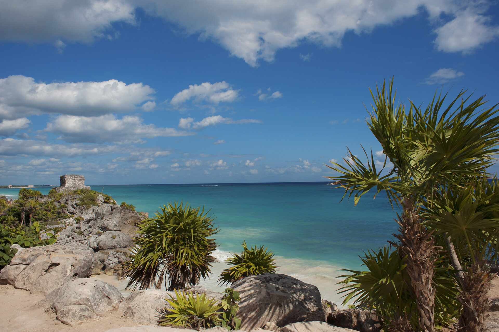 Tulum’s wide, pearly – white sandy beach with a crystal clear Caribbean waters, Tulum Mexico.