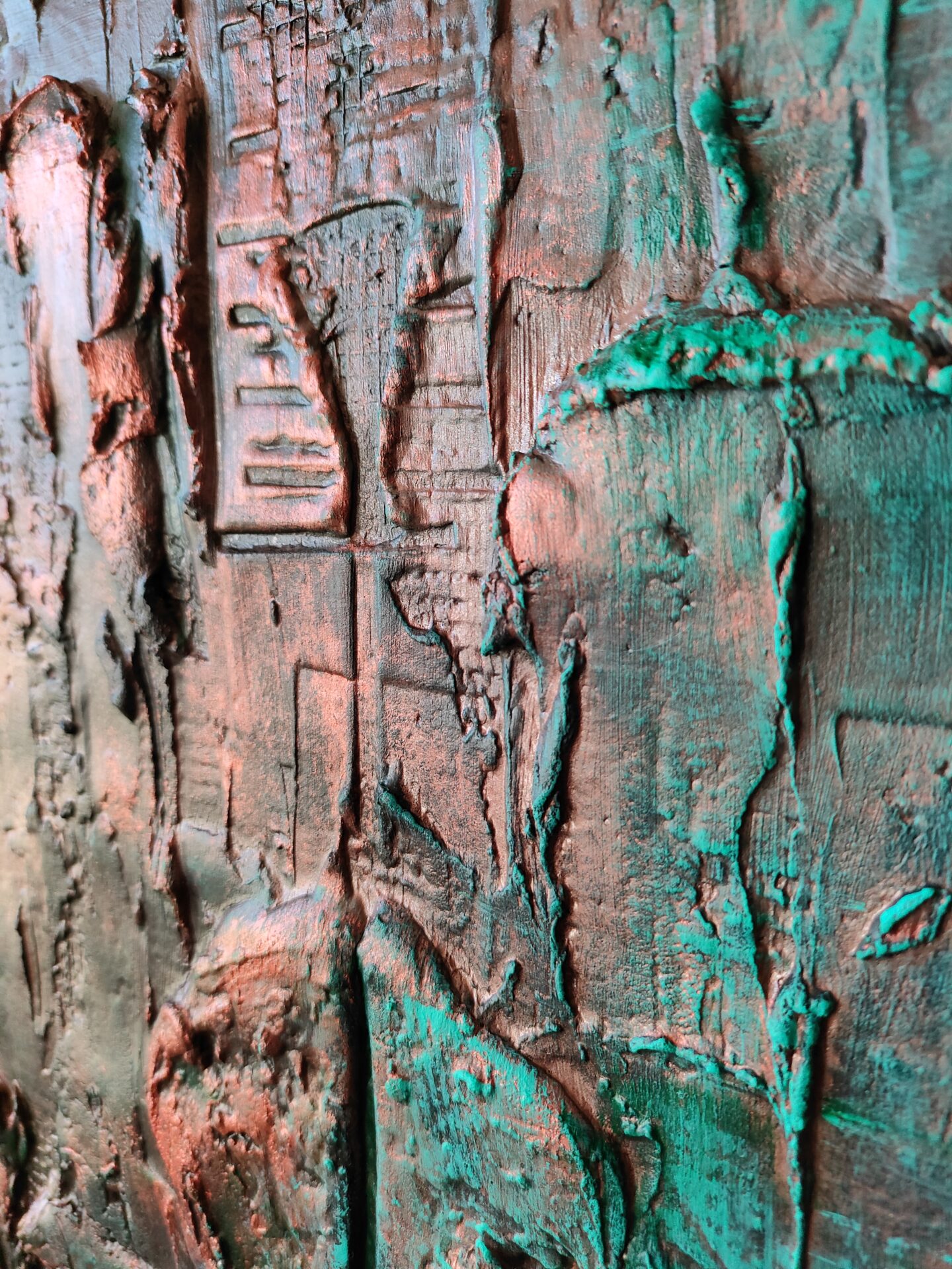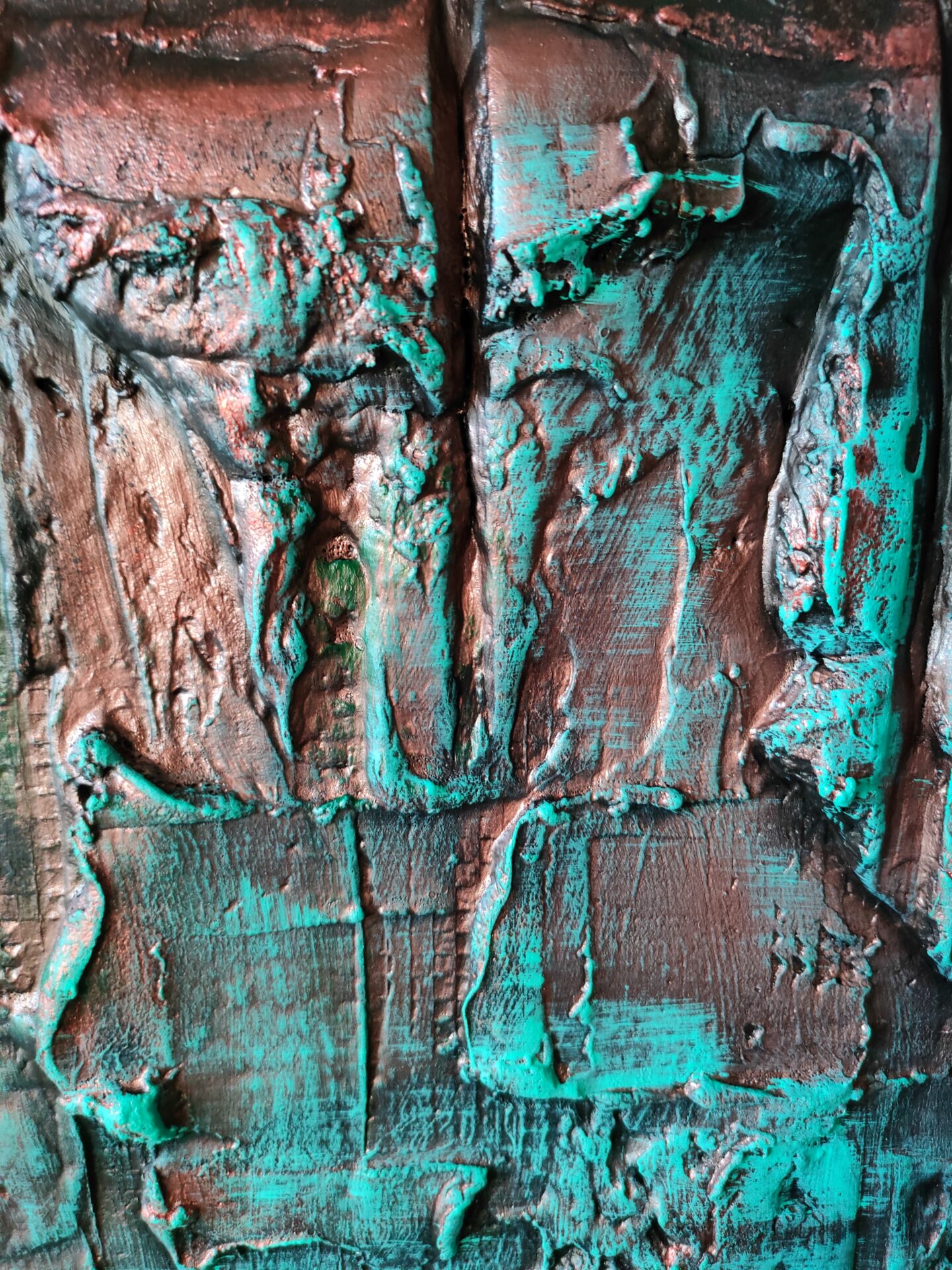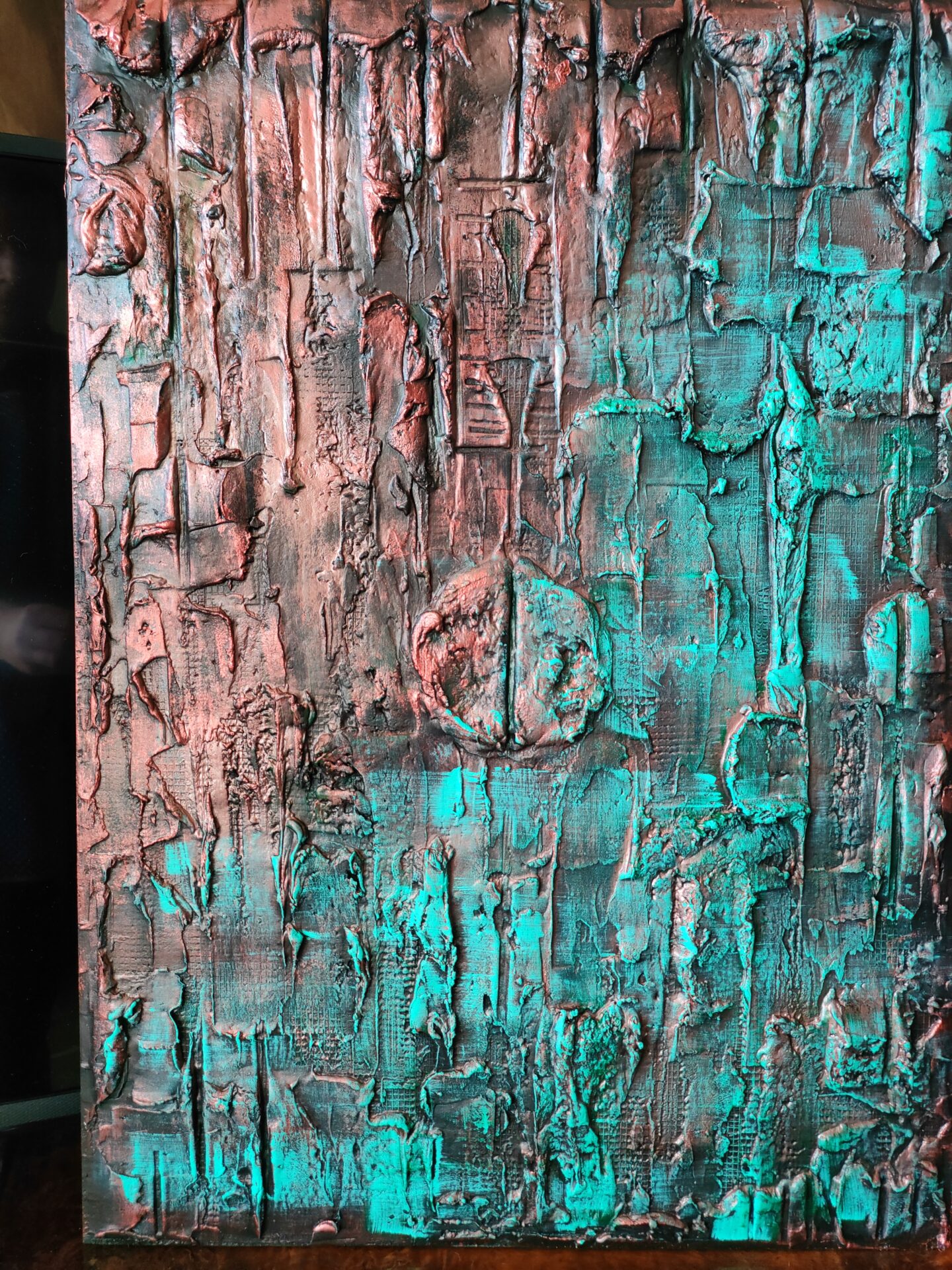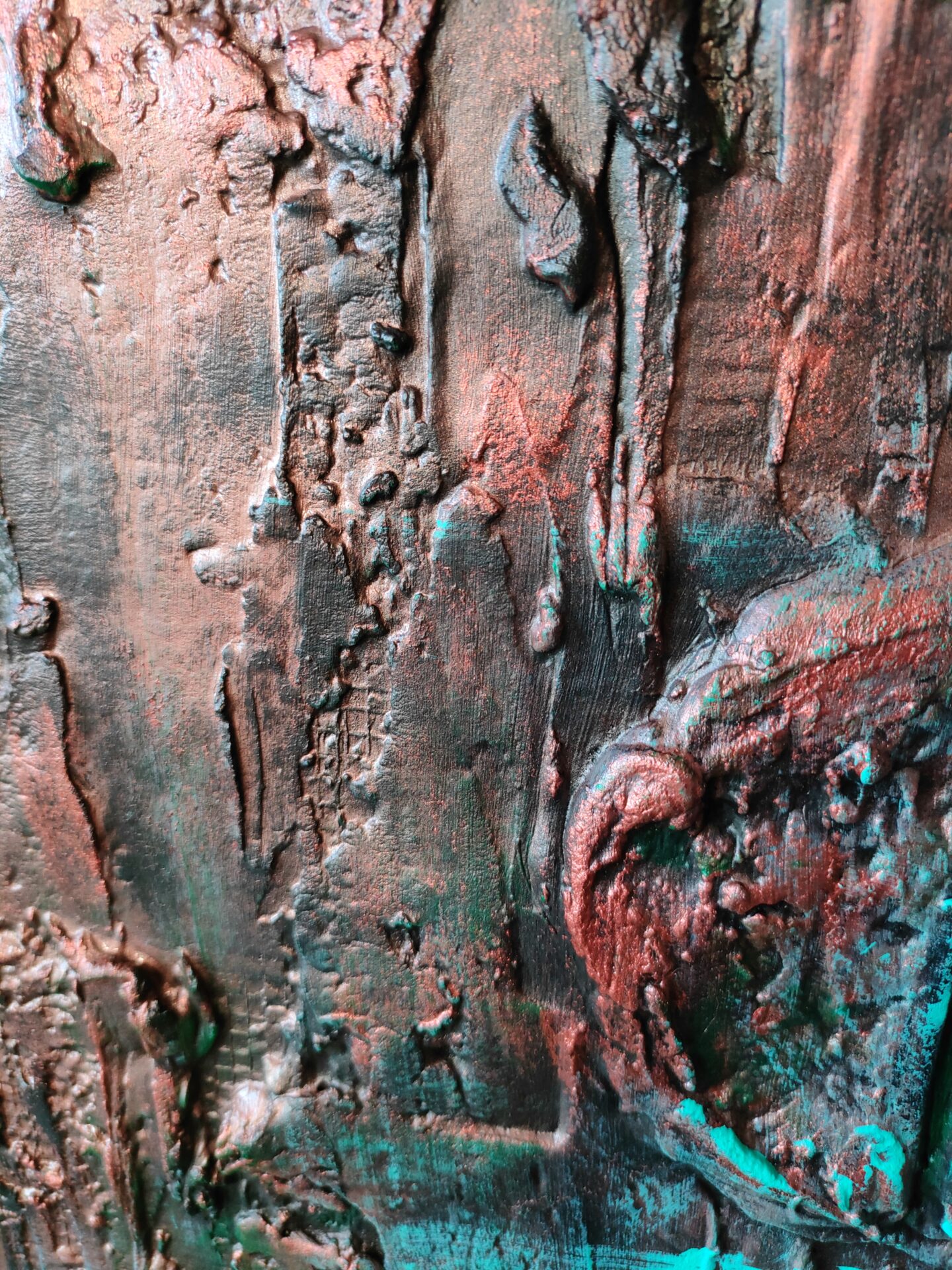 Witam, obraz strukturalny (technika własna,wyrażna faktura))namalowany farbami akrylowymi na płycie MDF, zabezpieczony podwójną warstwą lakieru,kolory to odcienie miedzi i turkusu