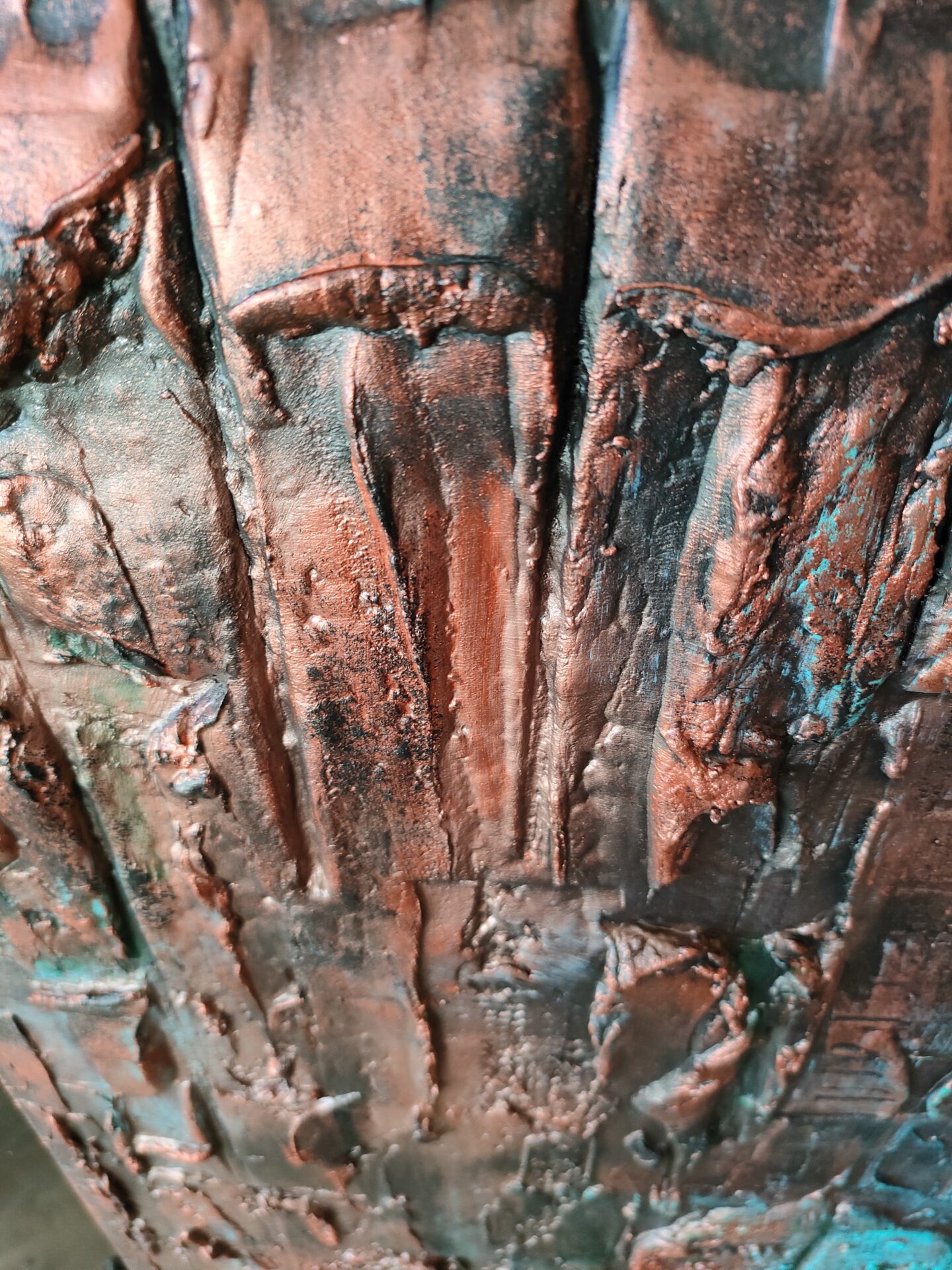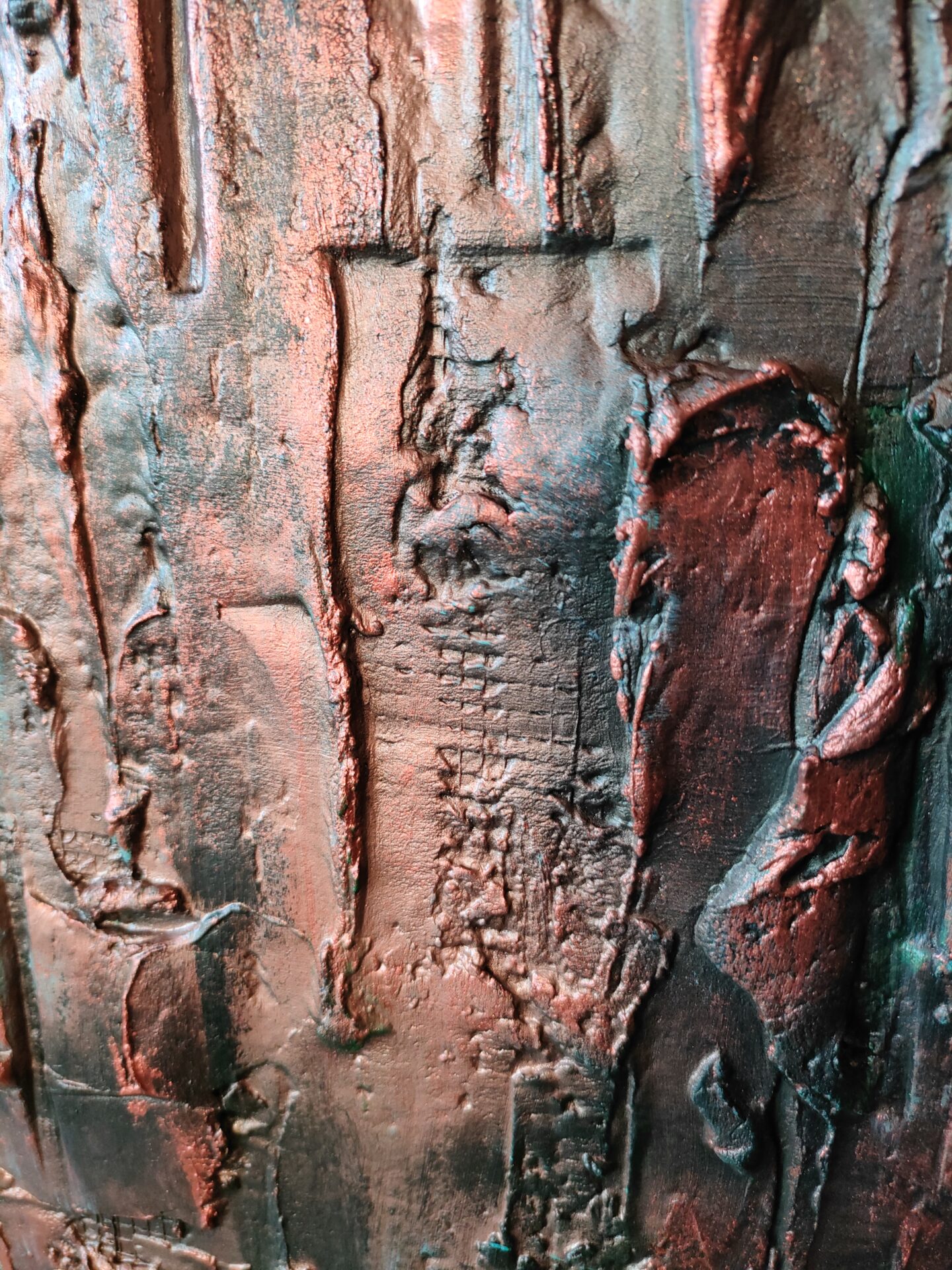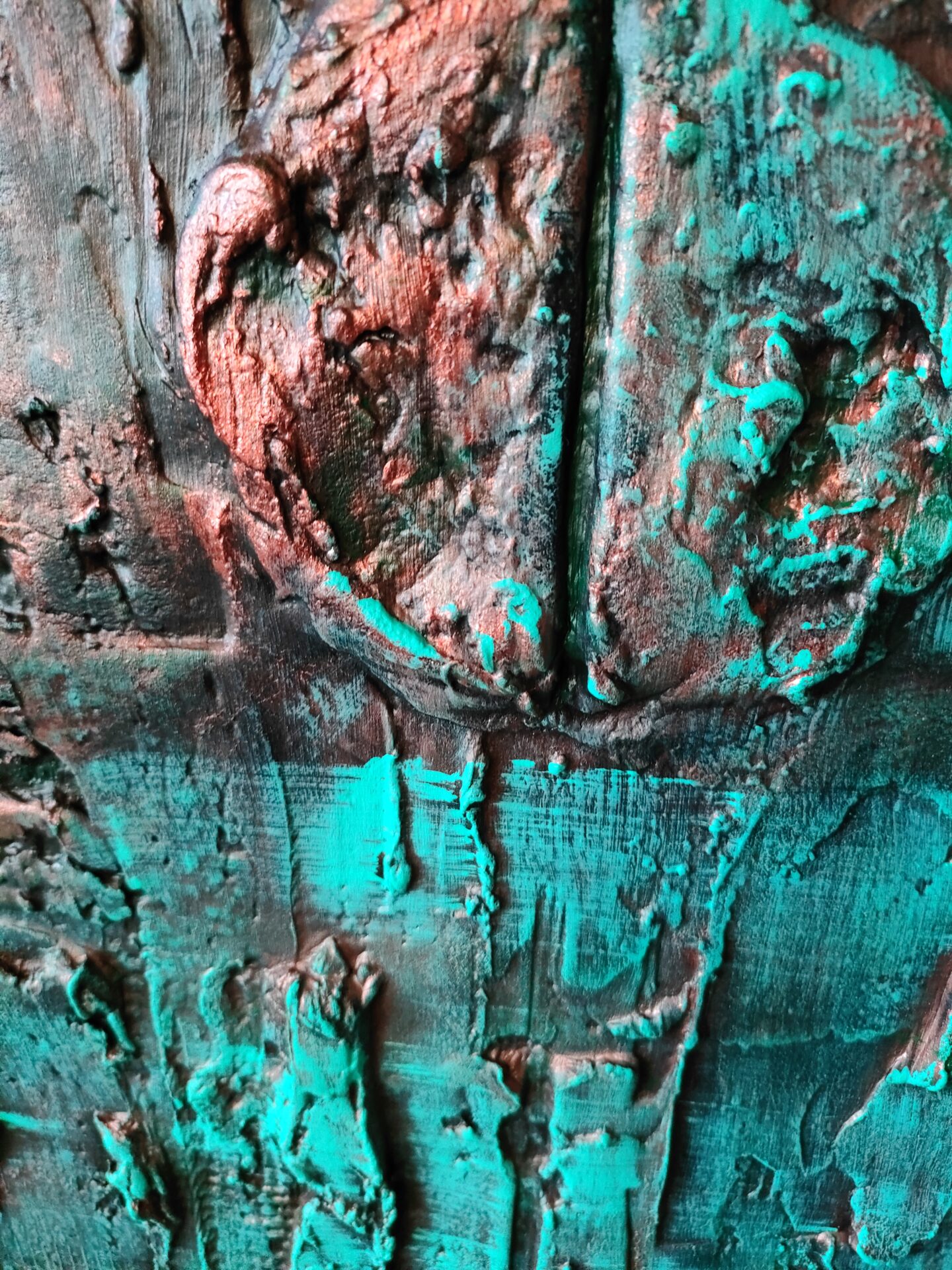 Witam, obraz strukturalny (technika własna,wyrażna faktura))namalowany farbami akrylowymi na płycie MDF, zabezpieczony podwójną warstwą lakieru,kolory to odcienie miedzi i turkusu
