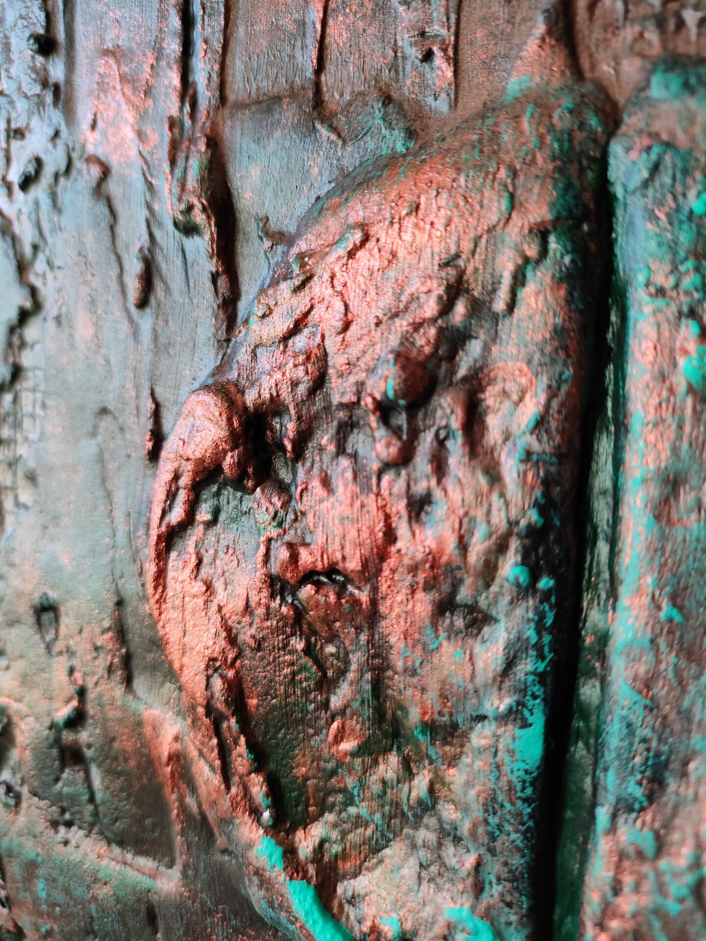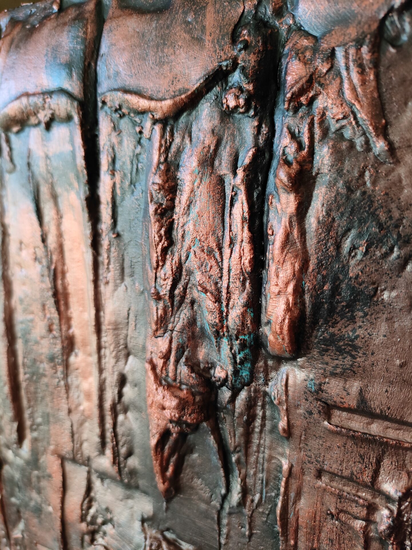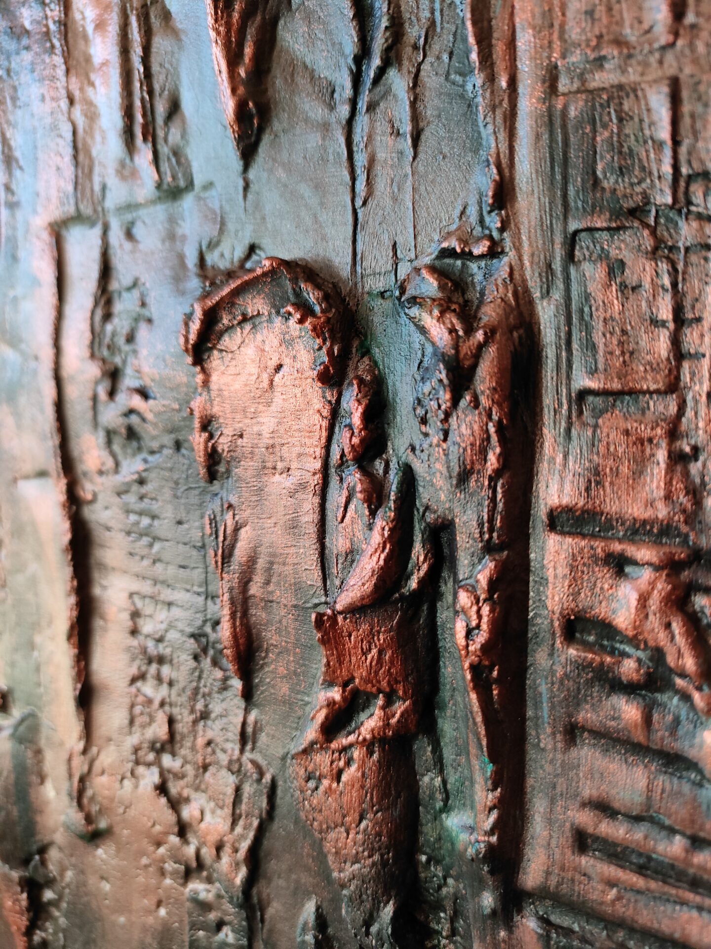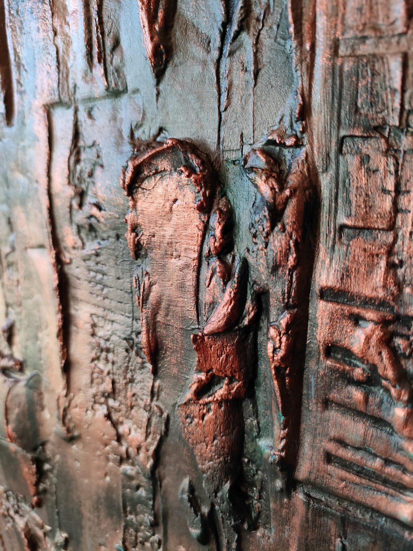 Witam, obraz strukturalny (technika własna,wyrażna faktura))namalowany farbami akrylowymi na płycie MDF, zabezpieczony podwójną warstwą lakieru,kolory to odcienie miedzi i turkusu