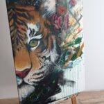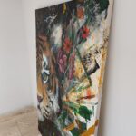 Obraz namalowany farbami akrylowymi na podobraziu bawełnianym, zabezpieczony werniksem w połysku. Obraz ma zamalowane boki, które są jego przedłużeniem co widać na zdjęciu.