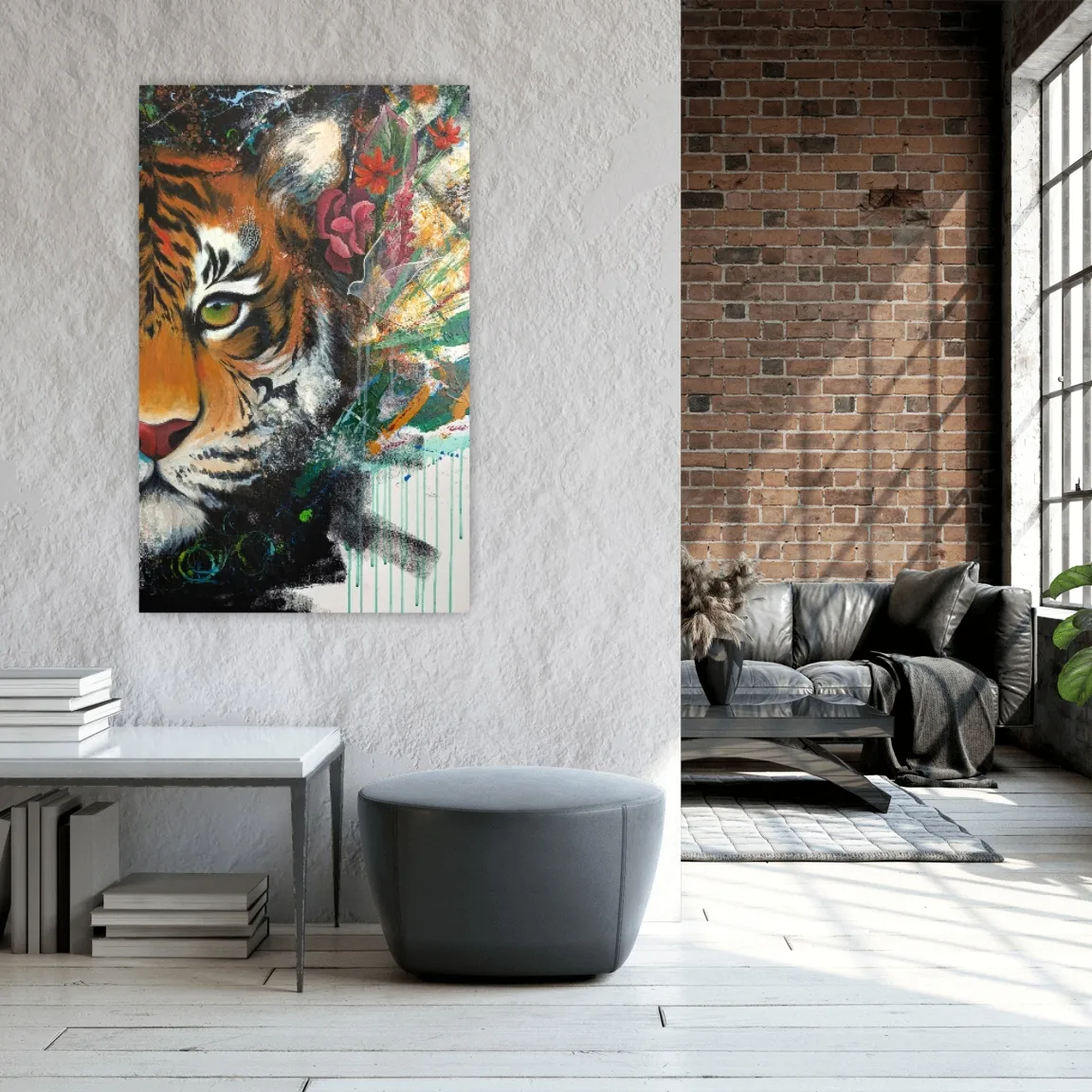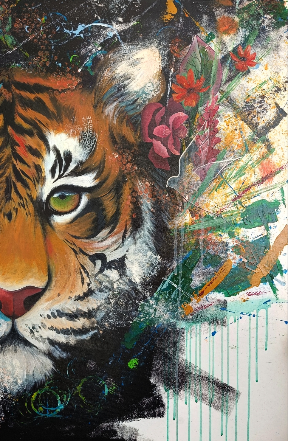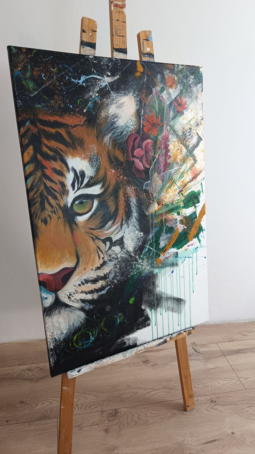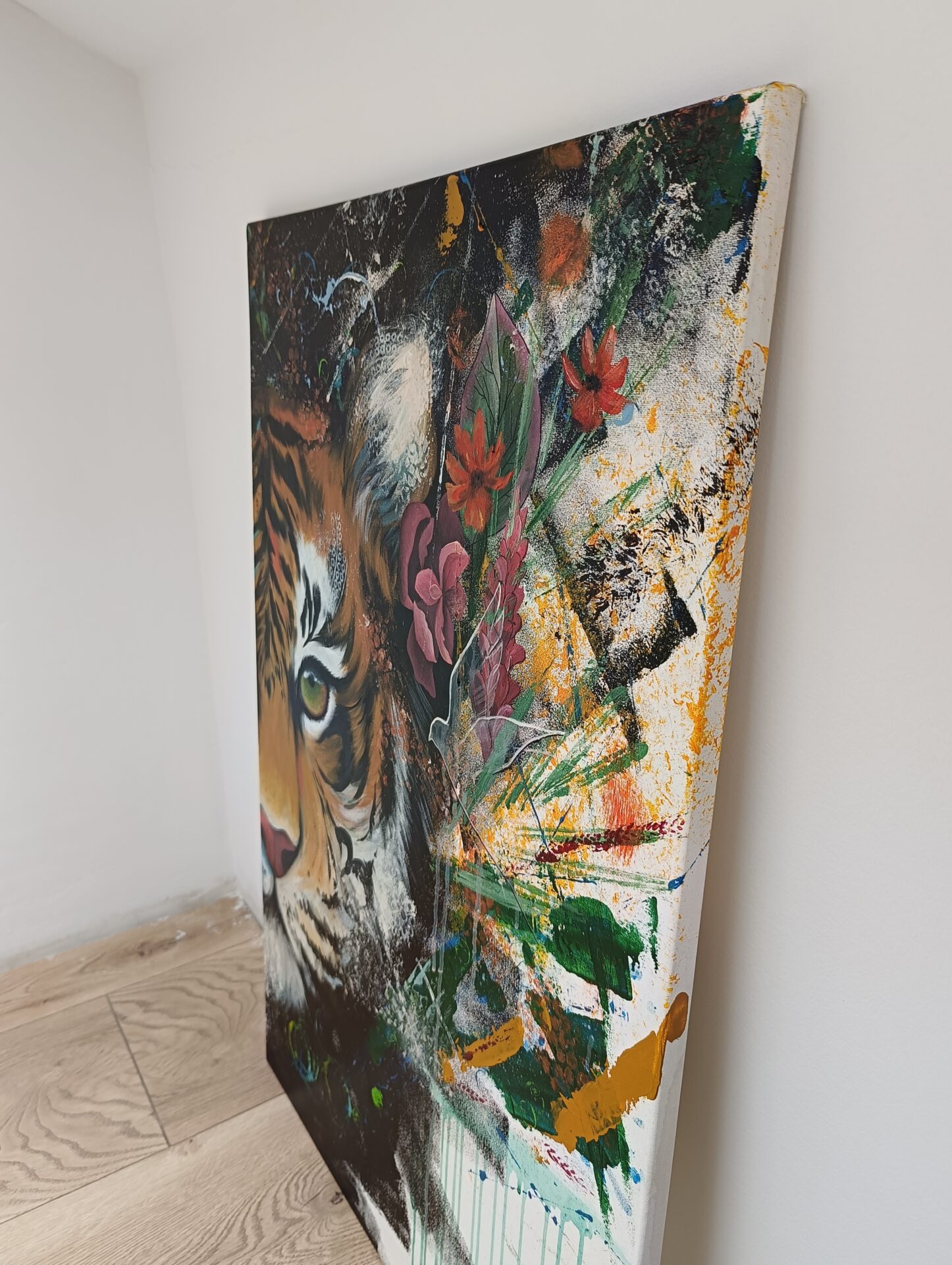 Obraz namalowany farbami akrylowymi na podobraziu bawełnianym, zabezpieczony werniksem w połysku. Obraz ma zamalowane boki, które są jego przedłużeniem co widać na zdjęciu.