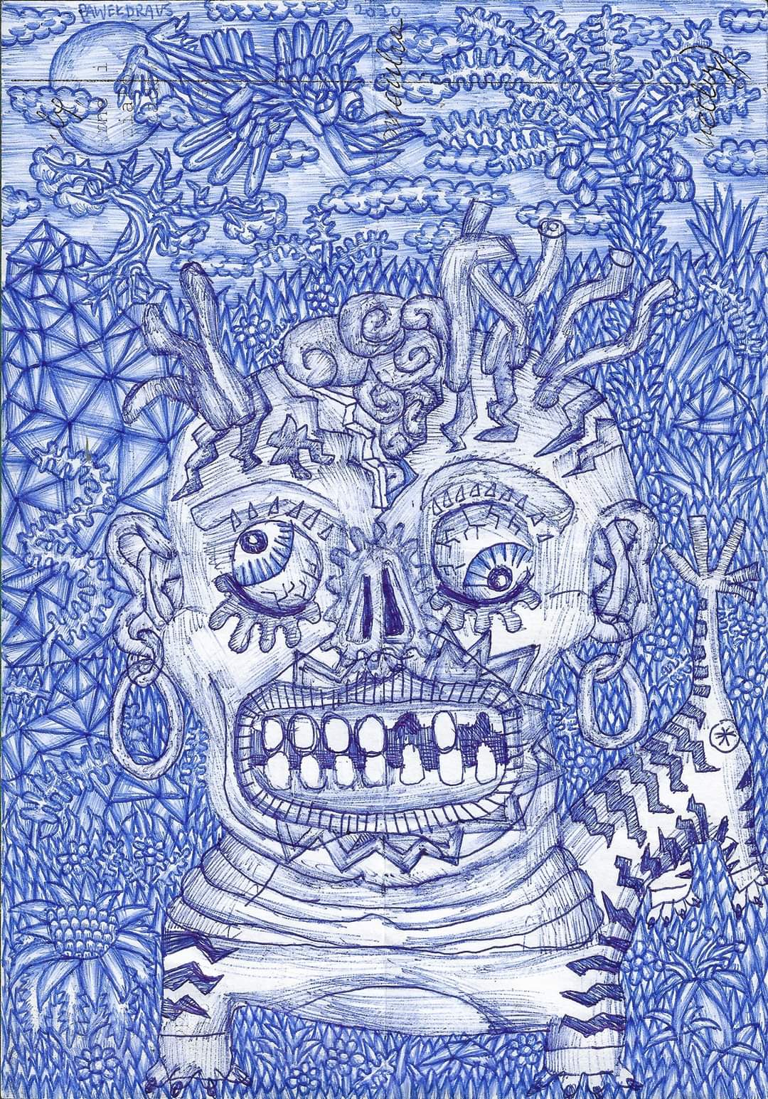 Materiały których użyłem to PAPIER I NIEBIESKI DŁUGOPIS. Format pracy A5 Jestem zainteresowany sprzedażą pracy jak i jej wydruku nawet w dużym formacie.
