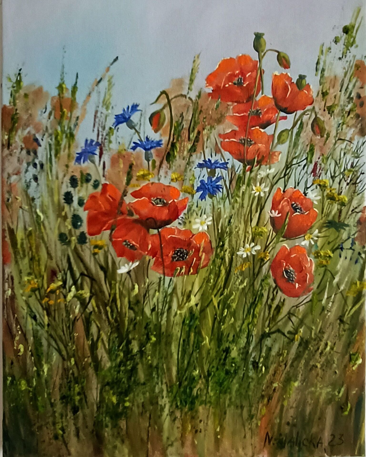 Obraz namalowany farbami olejnymi,30×40, gruba faktura na płótnie. Uwielbiam łąki z polnymi kwiatami..Maki są moim faworitem!