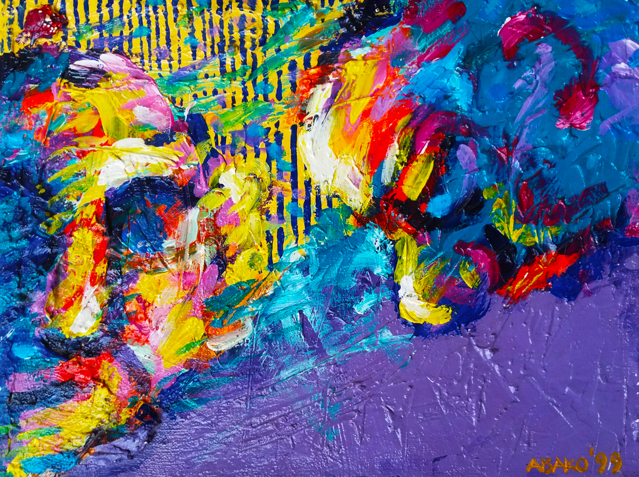 Olej, akryl na płótnie, sygn. p.d.: ABAKO’99, na odwrocie opis autorski, boczne krawędzie blejtramu zamalowane.